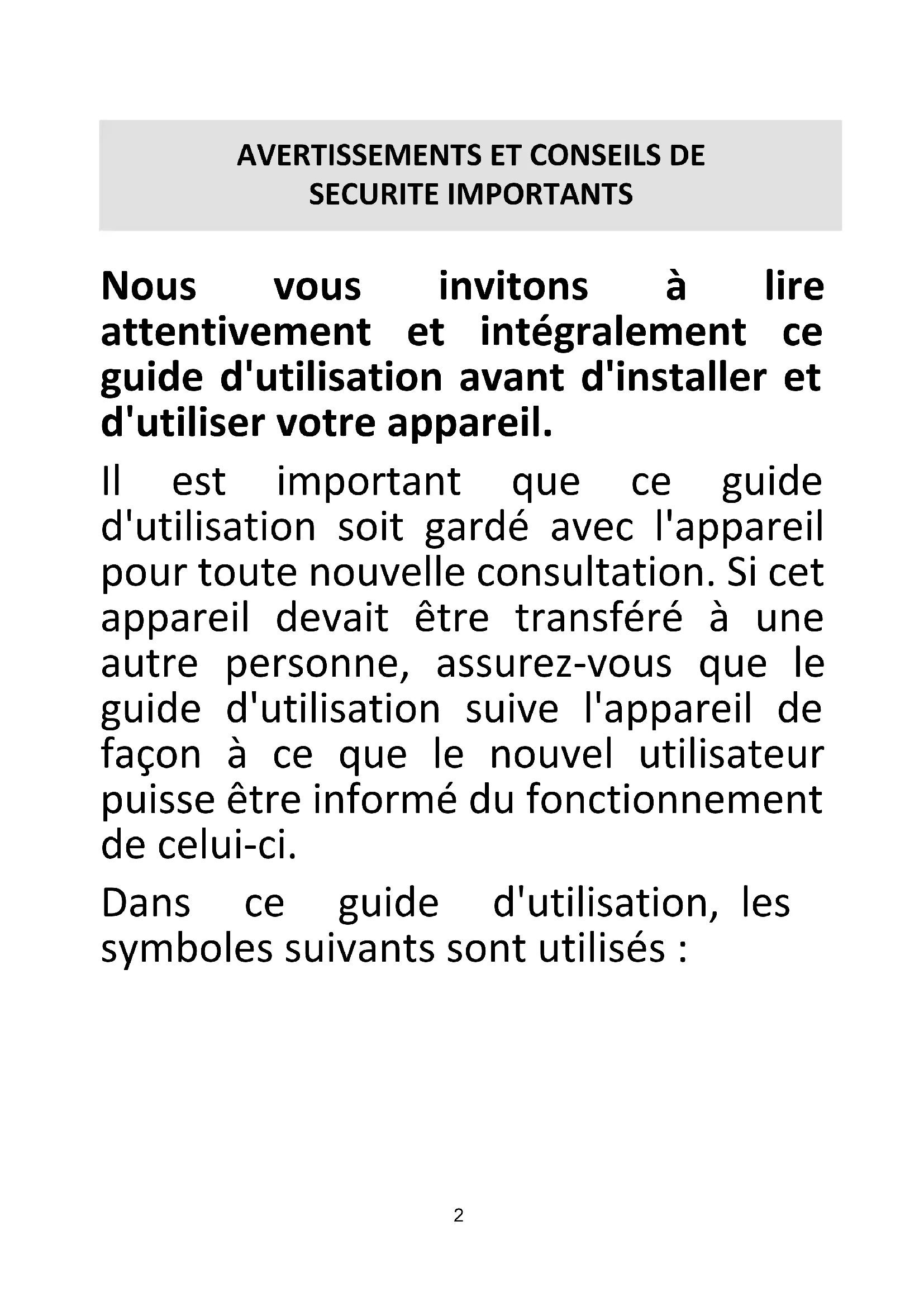 CEVCSFBF Aspirateur balai sans fil / Cordless broom vacuum cleaner Guide d'utilisation - User manual2 Nous vous invitons à lire attentivement et intégralement ce guide d'utilisation avant d'installer et d'utiliser votre appareil. Il est important que ce guide d'utilisation soit gardé avec l'appareil pour toute nouvelle consultation. Si cet appareil devait être transféré à une autre personne, assurez-vous que le guide d'utilisation suive l'appareil de façon à ce que le nouvel utilisateur puisse être informé du fonctionnement de celui-ci. Dans ce guide d'utilisation, les symboles suivants sont utilisés :