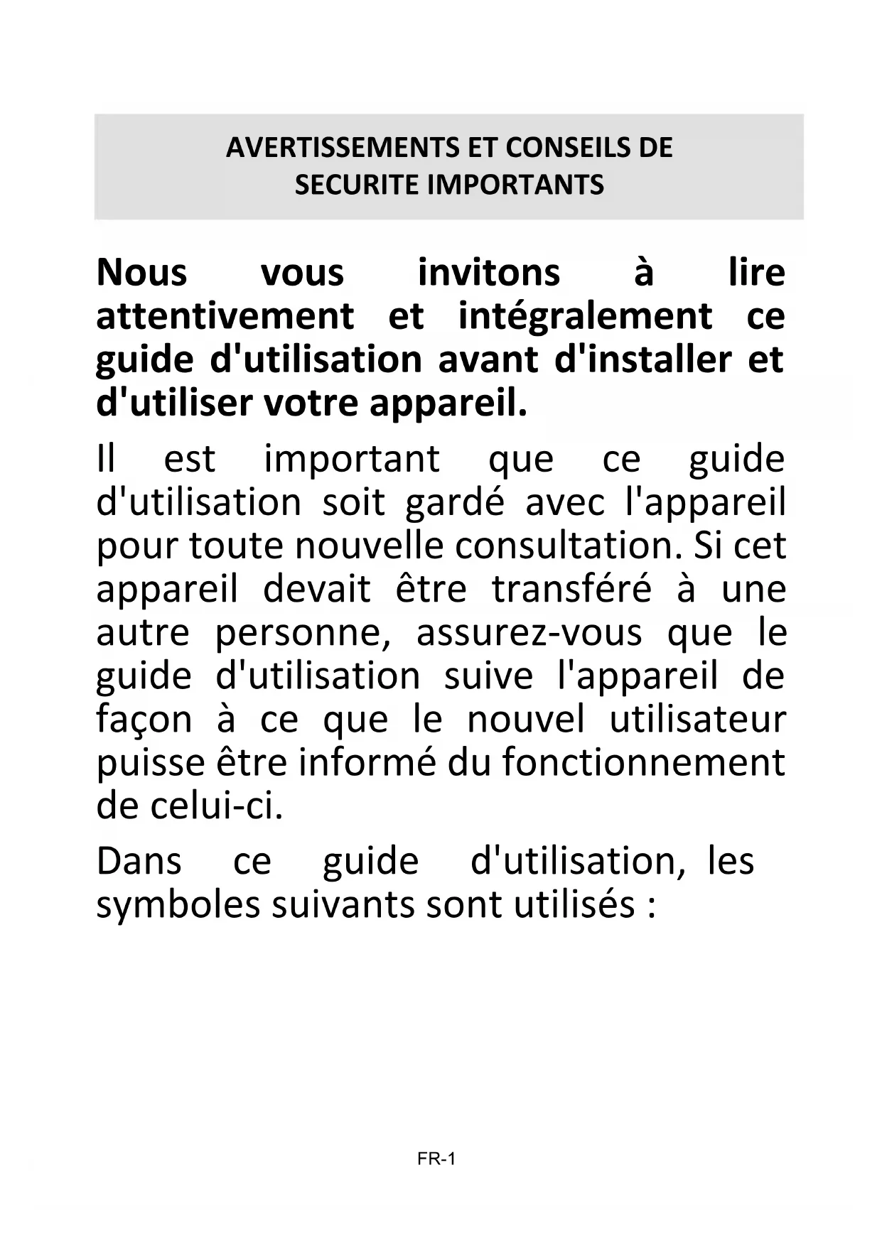 SECURITE IMPORTANTSFR-2 Informations importantes concernant votre sécurité personnelle et comment éviter d'endommager l'appareil Informations générales et conseils Risque de choc électriqueFR-3 Utilisation et précautions :