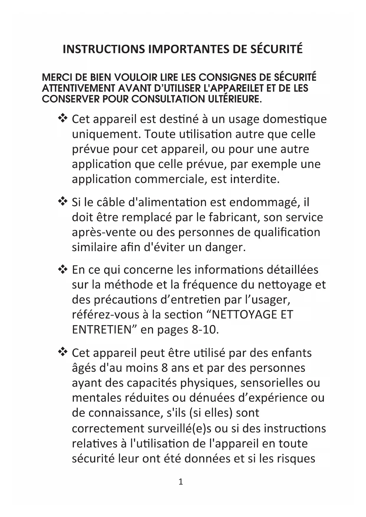 Cet appareil est destiné à un usage domestique uniquement. Toute utilisation autres que celle prévue pour cet appareil, ou pour une autre application que celle prévue, par exemple une application commerciale, est interdite. Si le câble d'alimentation est endommagé, il doit être remplacé par le fabricant, son service après-vente ou des personnes de qualification similaire afin d'éviter un danger. En ce qui concerne les informations détaillées sur la méthode et la fréquence du nettoyage et des précautions d'entretien par l'usager, référerez-vous à la section “NETTOYAGE ET ENTRETIEN” en pages 8-10. Cet appareil peut être utilisé par des enfants âgés d'au moins 8 ans et par des personnes ayant des capacités physiques, sensorielles ou mentales réduites ou dénuées d'expérience ou de connaissance, s'ils (si elles) sont correctement surveillés ou si des instructions relatives à l'utilisation de l'appareil en toute sécurité leur ont été données et si les risques