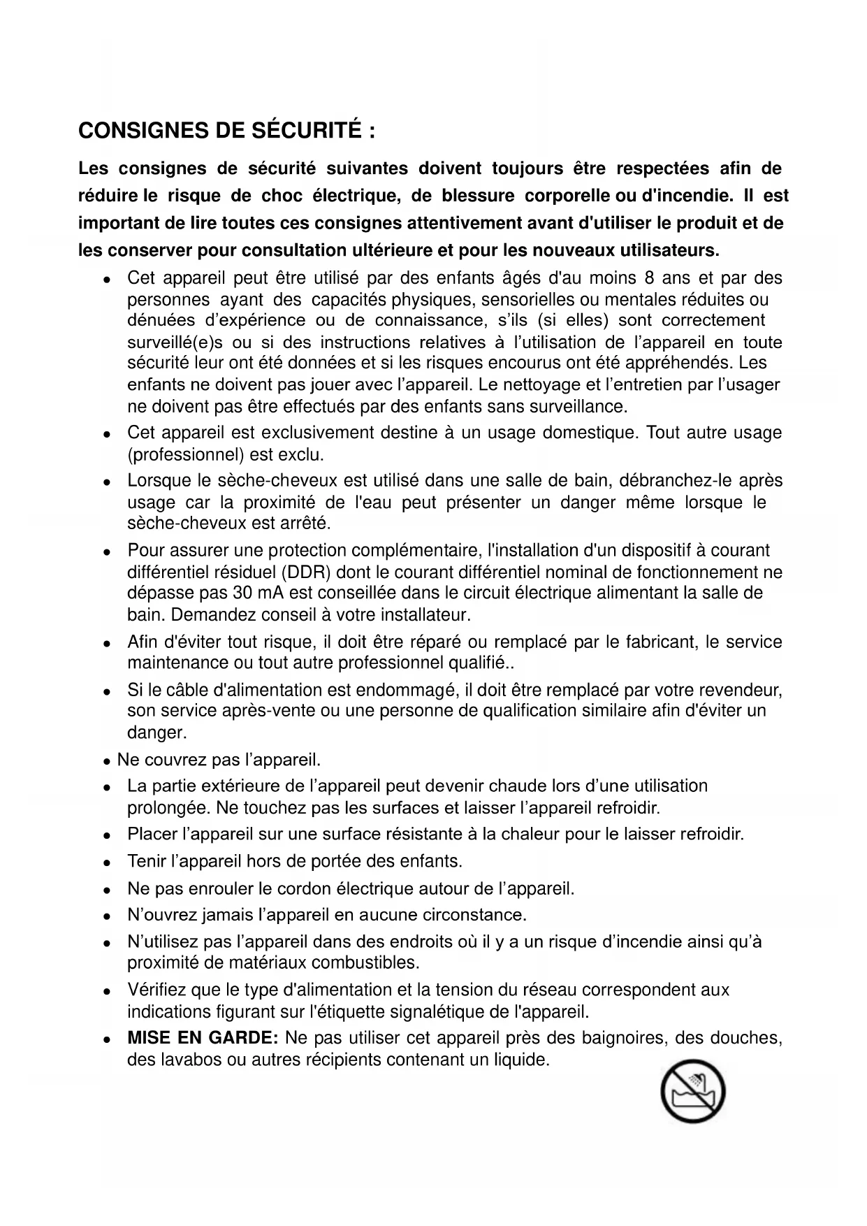 Manuel d’instructions - Instruction ManualCONSIGNES DE SÉCURITÉ : Les consignes de sécurité suivantes doivent toujours être respectées afin de réduire le risque de choc électrique, de blessure corporelle ou d'incendie. II est important de lire toutes ces consignes attentivement avant d'utiliser le produit et de les conserver pour consultation ultérieure et pour les nouveaux utilisateurs. Cet appareil peut être utilisé par des enfants âgés d'au moins 8 ans et par des personnes ayant des capacités physiques, sensorielles ou mentales réduites ou dénuées d’expérience ou de connaissance, s’ils (si elles) sont correctement surveillé(e)s ou si des instructions relatives à l’utilisation de l’appareil en toute sécurité leur ont été données et si les risques encourus ont été appréhendés. Les enfants ne doivent pas jouer avec l’appareil. Le nettoyage et l’entretien par l’usager ne doivent pas être effectués par des enfants sans surveillance. Cet appareil est exclusivement destine à un usage domestique. Tout autre usage (professionnel) est exclu. Lorsque le sèche-cheveux est utilisé dans une salle de bain, débranchez-le après usage car la proximité de l'eau peut présenter un danger même lorsque le sèche-cheveux est arrêté. Pour assurer une protection complémentaire, l'installation d'un dispositif à courant différentiel résiduel (DDR) dont le courant différentiel nominal de fonctionnement ne dépasse pas 30 mA est conseillée dans le circuit électrique alimentant la salle de bain. Demandez conseil à votre installateur. Afin d'éviter tout risque, il doit être réparé ou remplacé par le fabricant, le service maintenance ou tout autre professionnel qualifié.. Si le câble d'alimentation est endommagé, il doit être remplacé par votre revendeur, son service après-vente ou une personne de qualification similaire afin d'éviter un danger. Ne couvrez pas l’appareil. La partie extérieure de l’appareil peut devenir chaude lors d’une utilisation prolongée. Ne touchez pas les surfaces et laisser l’appareil refroidir. Placer l’appareil sur une surface résistante à la chaleur pour le laisser refroidir. Tenir l’appareil hors de portée des enfants. Ne pas enrouler le cordon électrique autour de l’appareil. N’ouvrez jamais l’appareil en aucune circonstance. N’utilisez pas l’appareil dans des endroits où il y a un risque d’incendie ainsi qu’à proximité de matériaux combustibles. Vérifiez que le type d'alimentation et la tension du réseau correspondent aux indications figurant sur l'étiquette signalétique de l'appareil. MISE EN GARDE: Ne pas utiliser cet appareil près des baignoires, des douches, des lavabos ou autres récipients contenant un liquide.DESCRIPTION A. Diffuseur concentré B. Entrée d'air C. Fonction air frais D. Réglage du niveau de chaleur E. Réglage du niveau de flux d’air F. Anneau de suspension G. Diffuseur