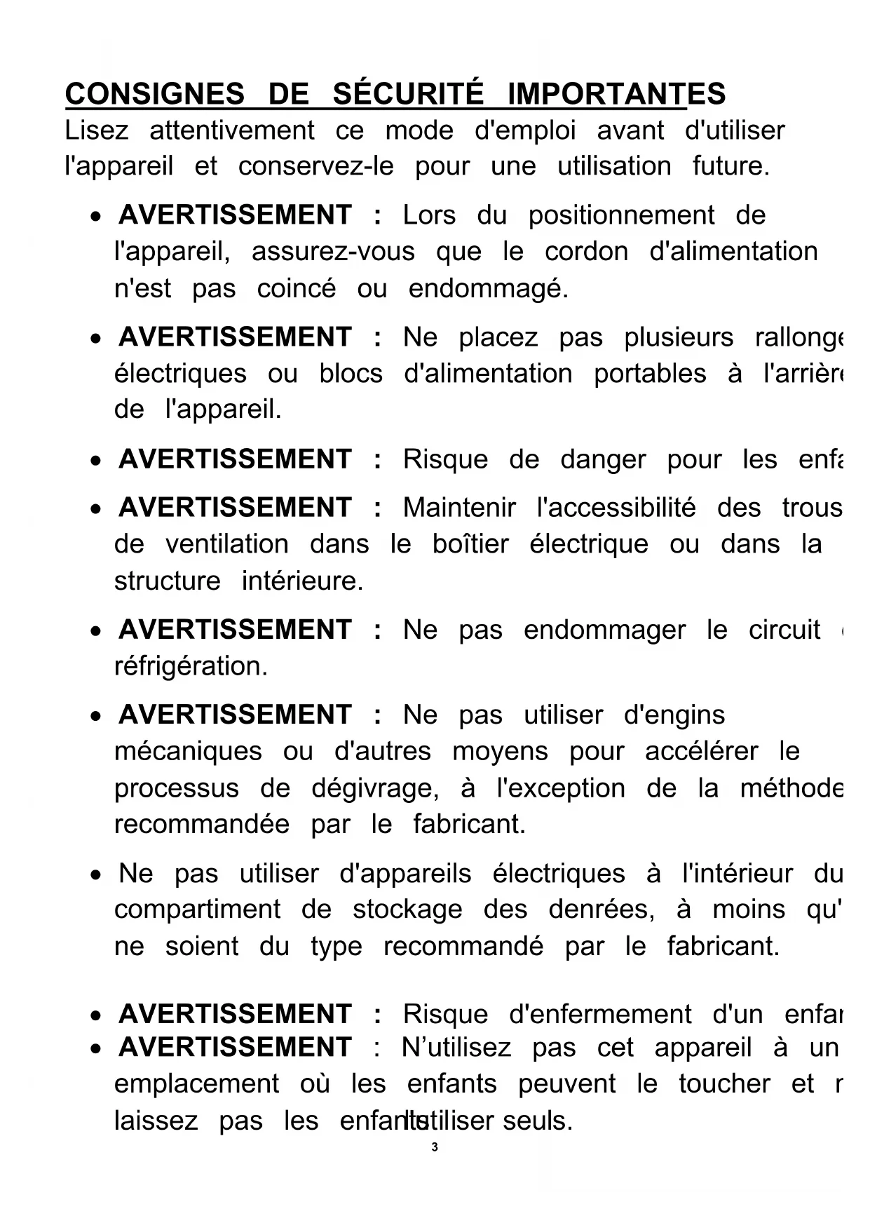mécaniques ou d'autres moyens pour accélérer le processus de dégivrage, à l'exception de la méthode recommandée par le fabricant. Ne pas utiliser d'appareils électriques à l'intérieur du compartiment de stockage des denrées, à moins qu'ils ne soient du type recommandé par le fabricant.