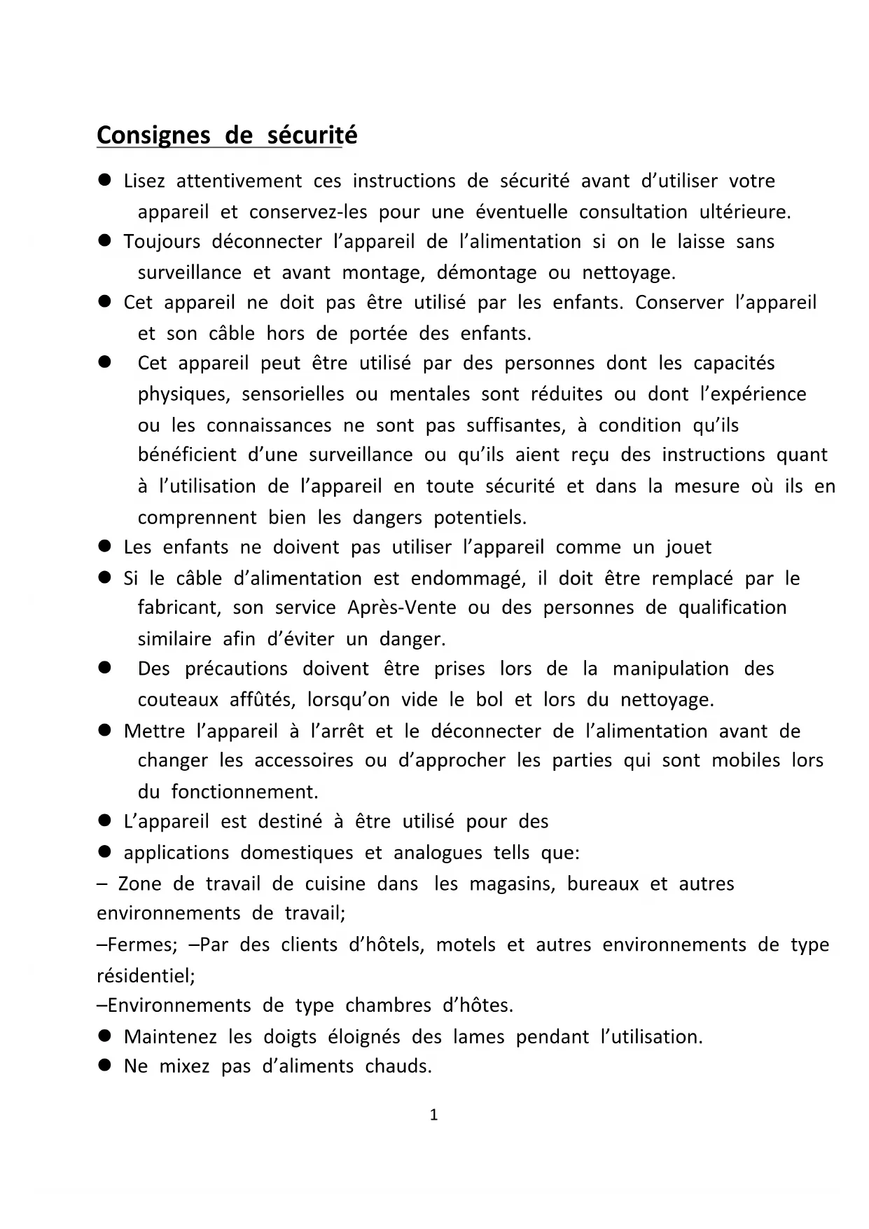 Blender à Haute Vitesse - High Speed Blender1 Consignes de sécurité Lisez attentivement ces instructions de sécurité avant d’utiliser votre appareil et conservez-les pour une éventuelle consultation ultérieure. Toujours déconnecter l’appareil de l’alimentation si on le laisse sans surveillance et avant montage, démontage ou nettoyage. Cet appareil ne doit pas être utilisé par les enfants. Conserver l’appareil et son câble hors de portée des enfants. Cet appareil peut être utilisé par des personnes dont les capacités physiques, sensorielles ou mentales sont réduites ou dont l’expérience ou les connaissances ne sont pas suffisantes, à condition qu’ils bénéficient d’une surveillance ou qu’ils aient reçu des instructions quant à l’utilisation de l’appareil en toute sécurité et dans la mesure où ils en comprennent bien les dangers potentiels. Les enfants ne doivent pas utiliser l’appareil comme un jouet Si le câble d’alimentation est endommagé, il doit être remplacé par le fabricant, son service Après-Vente ou des personnes de qualification similaire afin d’éviter un danger. Des précautions doivent être prises lors de la manipulation des couteaux affûtés, lorsqu’on vide le bol et lors du nettoyage. Mettre l’appareil à l’arrêt et le déconnecter de l’alimentation avant de changer les accessoires ou d’approcher les parties qui sont mobiles lors du fonctionnement. L’appareil est destiné à être utilisé pour des applications domestiques et analogues tells que: – Zone de travail de cuisine dans les magasins, bureaux et autres environnements de travail; –Fermes; –Par des clients d’hôtels, motels et autres environnements de type résidentiel; –Environnements de type chambres d’hôtes. Maintenez les doigts éloignés des lames pendant l’utilisation. Ne mixez pas d’aliments chauds.2 Utilisez toujours l’appareil posé sur une surface plane. N’appuyez pas sur le bouton marche/arrêt avant d’avoir branché l’appareil dans une prise électrique. Débranchez l’appareil en saisissant la fiche, ne tirez pas sur le cordon d’alimentation. La durée de fonctionnement en continu ne doit pas dépasser 2 minutes. N’utilisez pas votre appareil avec une rallonge électrique. Utilisez toujours l’appareil en le branchant dans une prise électrique fournissant un courant dont la tension (courant alternatif uniquement) correspond à celle indiquée sur l’appareil. N’utilisez pas un appareil à un usage autre que celui pour lequel il a été conçu. Ne placez pas l’appareil sur ou près d’une table de cuisson à gaz ou électrique ou d’un four chaud. Ne le placez pas sur un autre appareil. Veillez à ce que le cordon d’alimentation ne pende pas du bord d’une table ou d’un comptoir et ne touche aucune surface chaude. N’utilisez pas un appareil électrique si son cordon d’alimentation ou sa fiche est endommagé, s’il est tombé ou s’il a été endommagé. N’immergez pas le bloc moteur dans de l’eau ni dans aucun autre liquide, sauf indication contraire. Les lames sont aiguisées. Manipulez-les avec précaution. La manière de nettoyer les surfaces en contact avec les aliments est définie dans la section “ NETTOYAGE ET ENTRETIEN ”. Ne dépassez pas les quantités et la durée maximale indiquée dans les consignes d’utilisation et le guide de préparation.3 Nettoyage et Entretien