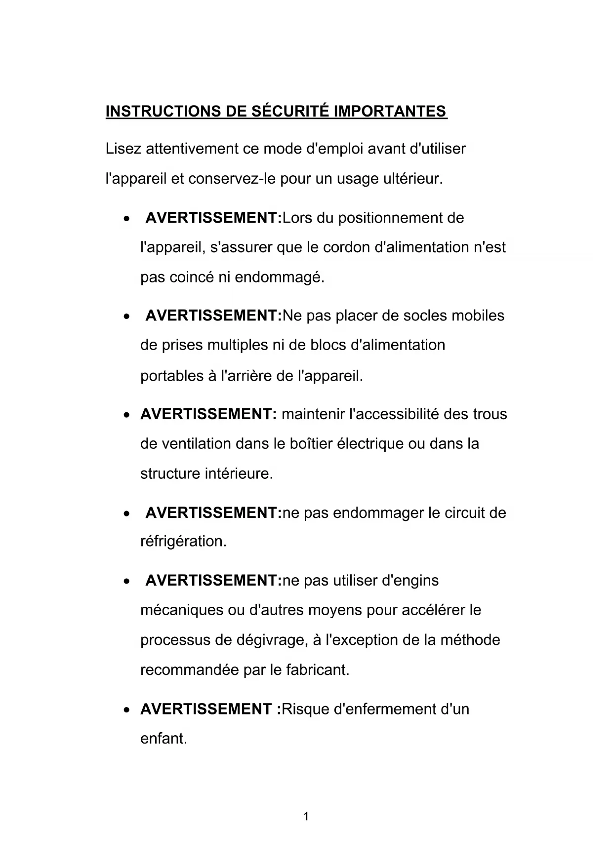 CECWC24BC CAVE À VIN - WINE CELLARINSTRUCTIONS DE SÉCURITÉ IMPORTANTES Lisez attentivement ce mode d'emploi avant d'utiliser l'appareil et conservez-le pour un usage ultérieur. x AVERTISSEMENT:Lors du positionnement de l'appareil, s'assurer que le cordon d'alimentation n'est pas coincé ni endommagé. x AVERTISSEMENT:Ne pas placer de socles mobiles de prises multiples ni de blocs d'alimentation portables à l'arrière de l'appareil. x AVERTISSEMENT: maintenir l'accessibilité des trous de ventilation dans le boîtier électrique ou dans la structure intérieure. x AVERTISSEMENT:ne pas endommager le circuit de réfrigération. x AVERTISSEMENT:ne pas utiliser d'engins mécaniques ou d'autres moyens pour accélérer le processus de dégivrage, à l'exception de la méthode recommandée par le fabricant. x AVERTISSEMENT :Risque d'enfermement d'un enfant.