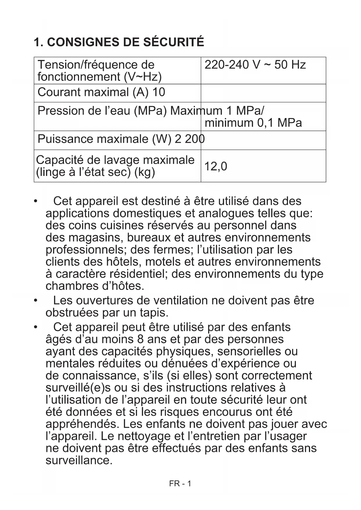 Tension/fréquence de fonctionnement (V~Hz) 220-240 V ~ 50 Hz Courant maximal (A) 10 Pression de l’eau (MPa) Maximum 1 MPa/ minimum 0,1 MPa Puissance maximale (W) 2 200 Capacité de lavage maximale (linge à l’état sec) (kg) 12,0