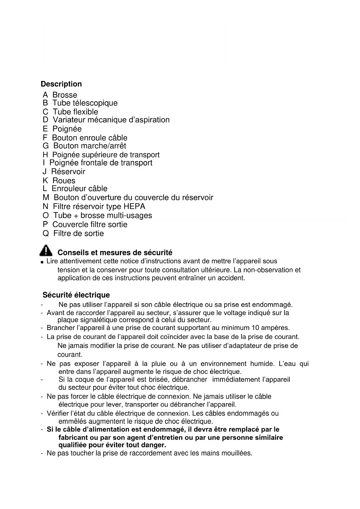 Fig. 6Description A Brosse B Tube télescopique C Tube flexible D Variateur mécanique d’aspiration E Poignée F Bouton enroule câble G Bouton marche/arrêt H Poignée supérieure de transport I Poignée frontale de transport J Réservoir K Roues L Enrouleur câble M Bouton d’ouverture du couvercle du réservoir N Filtre réservoir type HEPA O Tube + brosse multi-usages P Couvercle filtre sortie Q Filtre de sortie Conseils et mesures de sécurité Lire attentivement cette notice d’instructions avant de mettre l’appareil sous tension et la conserver pour toute consultation ultérieure. La non-observation et application de ces instructions peuvent entraîner un accident. Sécurité électrique - Ne pas utiliser l’appareil si son câble électrique ou sa prise est endommagé. - Avant de raccorder l’appareil au secteur, s’assurer que le voltage indiqué sur la plaque signalétique correspond à celui du secteur. - Brancher l’appareil à une prise de courant supportant au minimum 10 ampères. - La prise de courant de l’appareil doit coïncider avec la base de la prise de courant. Ne jamais modifier la prise de courant. Ne pas utiliser d’adaptateur de prise de courant. - Ne pas exposer l’appareil à la pluie ou à un environnement humide. L’eau qui entre dans l’appareil augmente le risque de choc électrique. - Si la coque de l’appareil est brisée, débrancher immédiatement l’appareil du secteur pour éviter tout choc électrique. - Ne pas forcer le câble électrique de connexion. Ne jamais utiliser le câble électrique pour lever, transporter ou débrancher l’appareil. - Vérifier l’état du câble électrique de connexion. Les câbles endommagés ou emmêlés augmentent le risque de choc électrique. - Si le câble d’alimentation est endommagé, il devra être remplacé par le fabricant ou par son agent d’entretien ou par une personne similaire qualifiée pour éviter tout danger. - Ne pas toucher la prise de raccordement avec les mains mouillées.Utilisation et précautions: - Ne pas utiliser l’appareil si ses accessoires et filtres ne sont pas correctement assemblés. - Ne pas utiliser l’appareil pour aspirer de l’eau ou autre liquide. - Ne pas utiliser l’appareil si son dispositif de mise en marche/arrêt ne fonctionne pas. - Ne pas forcer la capacité de travail de l’appareil. - Débrancher l’appareil du secteur tant qu’il reste hors d’usage et avant de procéder à toute opération de nettoyage, de changement d’accessoire, de filtre ou de sac. - Cet appareil est uniquement destiné à un usage domestique et non professionnel ou industriel.