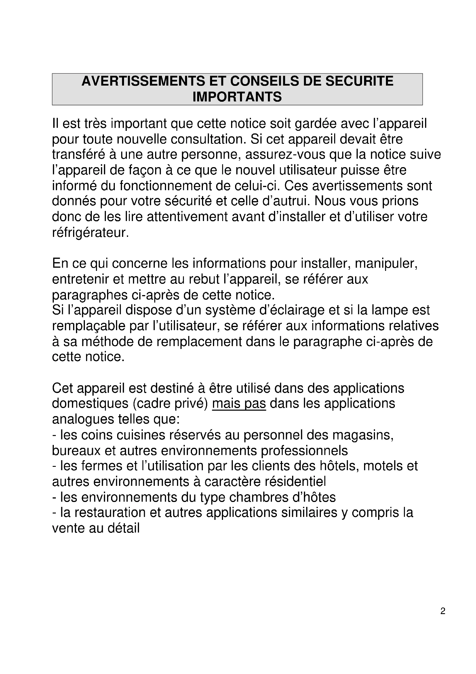 Il est très important que cette notice soit gardée avec l’appareil pour toute nouvelle consultation. Si cet appareil devait être transféré à une autre personne, assurez-vous que la notice suive l’appareil de façon à ce que le nouvel utilisateur puisse être informé du fonctionnement de celui-ci. Ces avertissements sont donnés pour votre sécurité et celle d’autrui. Nous vous prions donc de les lire attentivement avant d’installer et d’utiliser votre réfrigérateur. En ce qui concerne les informations pour installer, manipuler, entretenir et mettre au rebut l’appareil, se référer aux paragraphes ci-après de cette notice. Si l’appareil dispose d’un système d’éclairage et si la lampe est remplaçable par l’utilisateur, se référer aux informations relatives à sa méthode de remplacement dans le paragraphe ci-après de cette notice. Cet appareil est destiné à être utilisé dans des applications domestiques (cadre privé) mais pas dans les applications analogues telles que: - les coins cuisines réservés au personnel des magasins, bureaux et autres environnements professionnels - les fermes et l’utilisation par les clients des hôtels, motels et autres environnements à caractère résidentiel - les environnements du type chambres d’hôtes - la restauration et autres applications similaires y compris la vente au détail