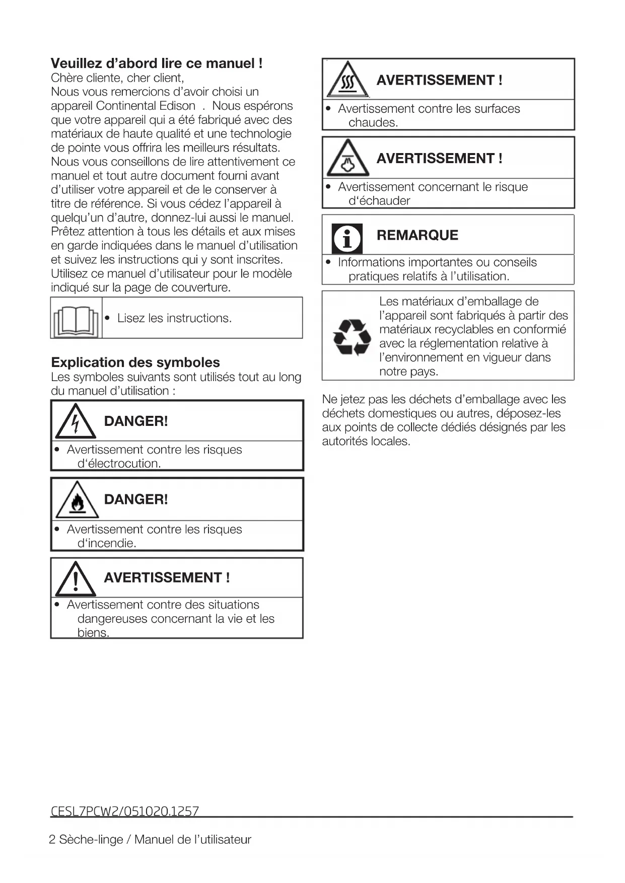 - Informations importantes ou conseils pratiques relatifs à l’utilisation. Les matériaux d’emballage de l’appareil sont fabriqués à partir des matériaux recyclables en conformié avec la réglementation relative à l’environnement en vigueur dans notre pays. Ne jetez pas les déchets d’emballage avec les déchets domestiques ou autres, déposez-les aux points de collecte dédiés désignés par les autorités locales. CESL7PCW2/051020.12573 Sèche-linge / Manuel de l’utilisateur 1 Consignes importantes en matière de sécurité et à surligner