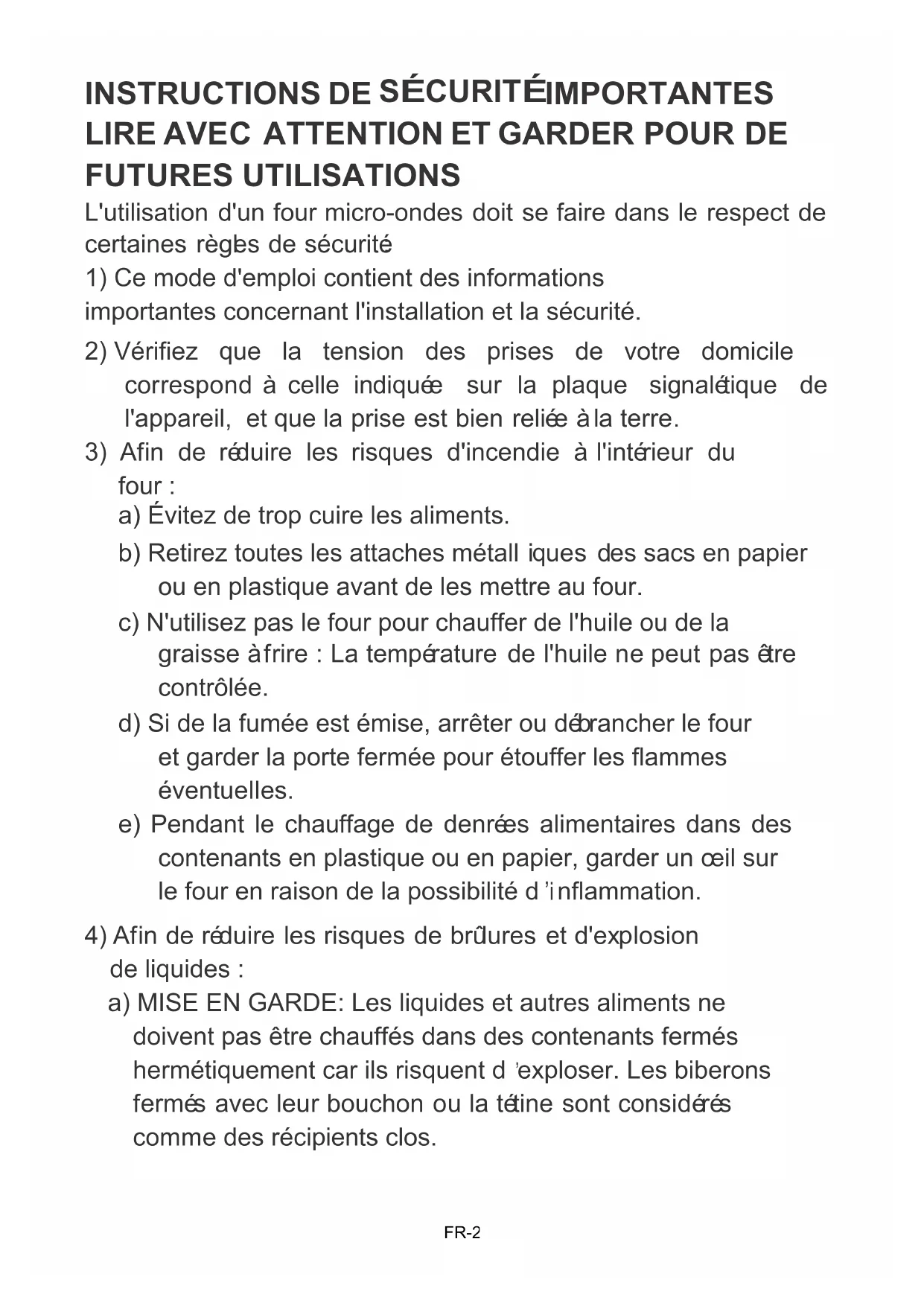 exploser. Les biberons fermés avec leur bouchon ou la tétine sont considérés comme des récipients clos. FR-2b) Le chauffage des boissons par micro-ondes peut provoquer un jaillissement brusque et différé de liquide en ébullition, aussi des précautions doivent être prises lors de la manipulation du récipient. c) Il n