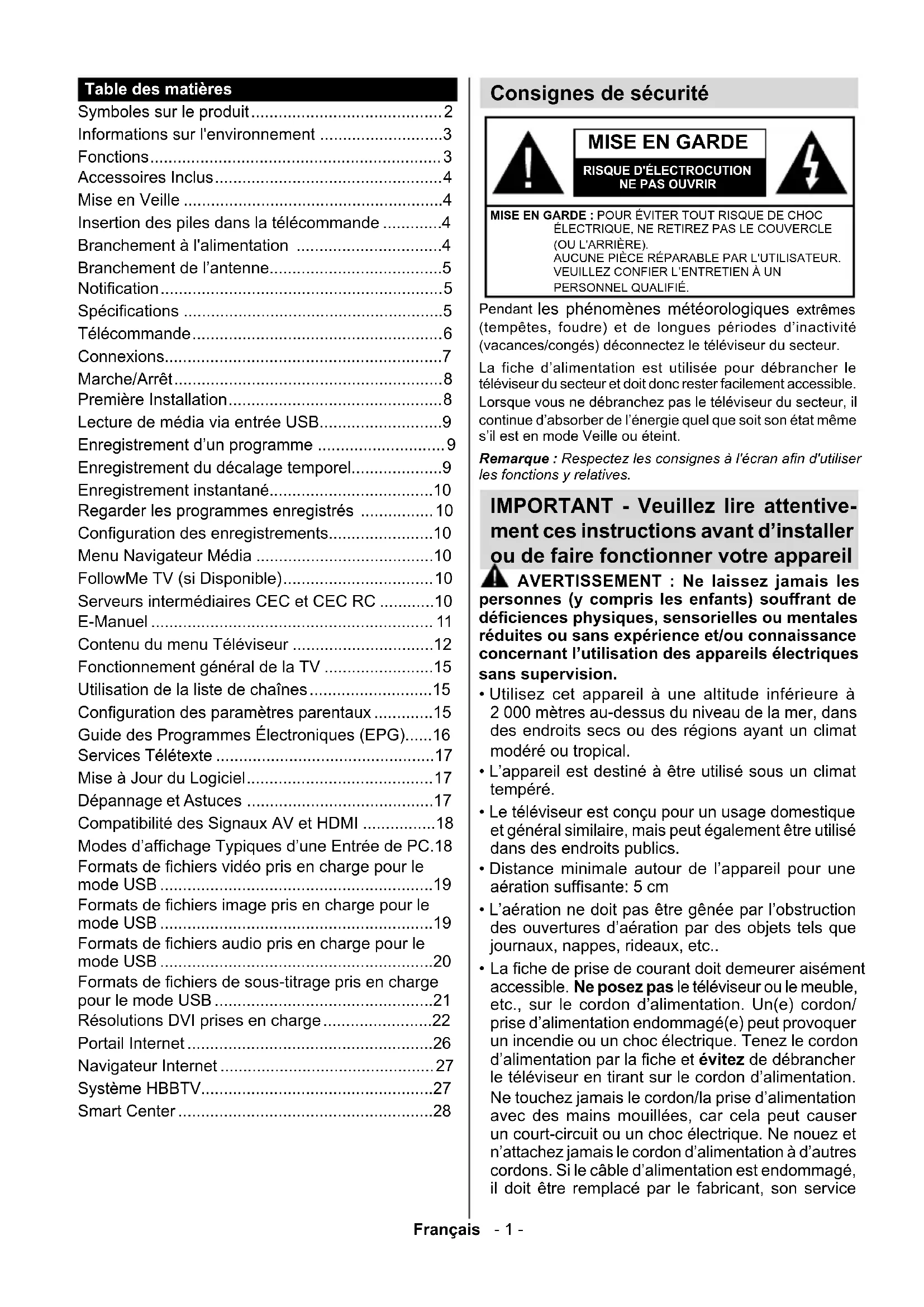 après vente ou des personnes de qualification similaire afin d'éviter un danger. - L'appareil ne doit pas être exposé à des égouttements d'eau ou des éclaboussures. Aucun objet rempli de liquide tel que des vases ne doit être placé sur l'appareil. - N'exposez pas le téléviseur à la lumière directe du soleil ou ne placez/dirigez pas des flammes nues telles que les bougies allumées au-dessus ou à proximité du téléviseur. - Ne pas placer sur l'appareil des sources de flammes nues, telles que des bougies allumées. - Ne placez pas des sources de chaleur telles que les chauffages électriques, les radiateurs, etc. à proximité du téléviseur. - Ne posez pas le téléviseur à même le sol et sur des surfaces inclinées. - Pour éviter des risques de suffocation, tenez les sacs plastiques hors de la portée des bébés, enfants et des animaux domestiques. Fixez soigneusement le support au téléviseur. Si le support est fourni avec des vis, serrez-les fermement pour éviter que le téléviseur ne s'incline. Ne serrez pas trop les vis et montez convenablement les supports en caoutchouc. - N'éliminez pas les batteries dans le feu ou avec des matériaux dangereux ou inflammables.
