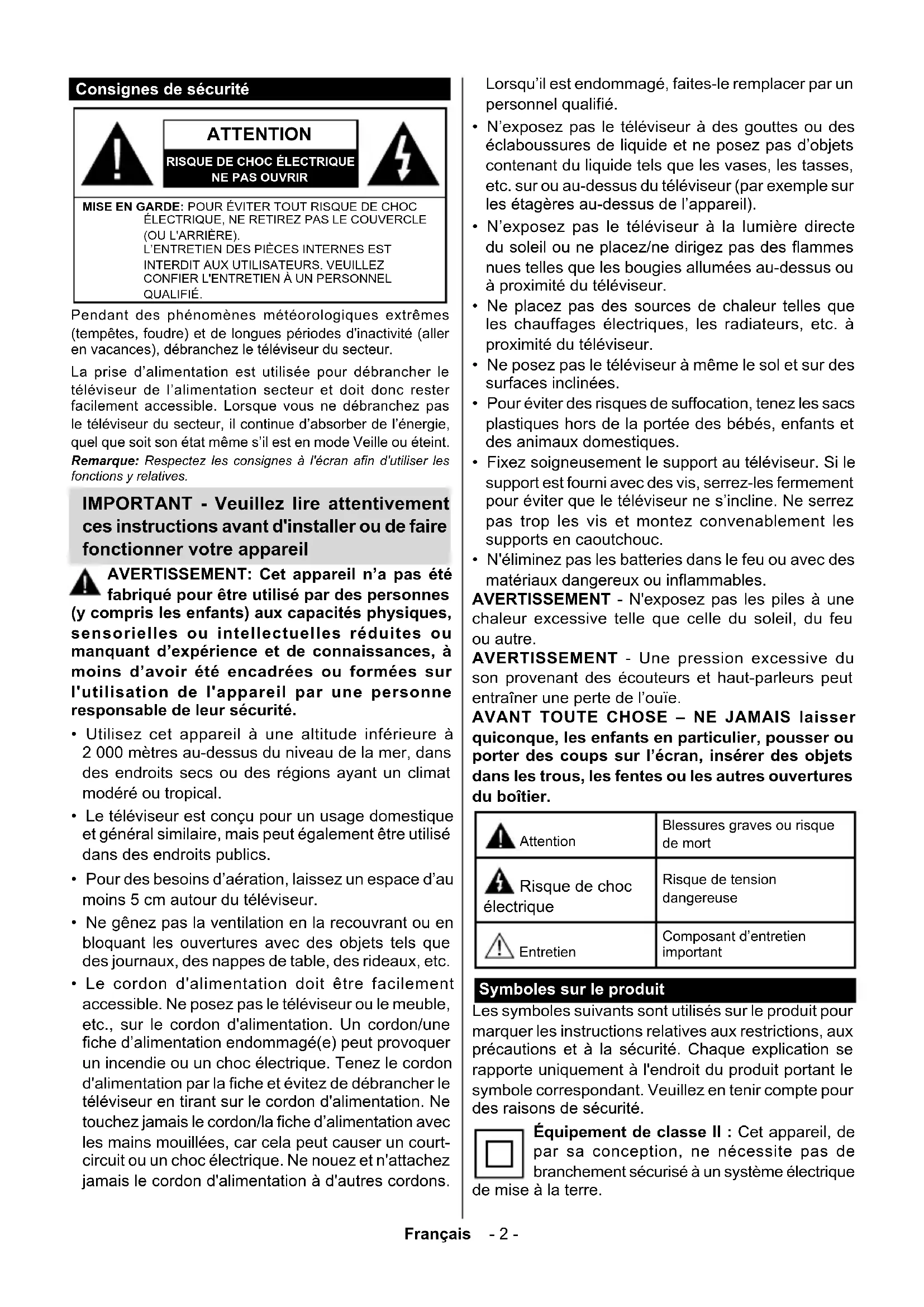 - N'éliminez pas les batteries dans le feu ou avec des matériaux dangereux ou inflammables. AVERTISSEMENT - N'exposez pas les piles à une chaleur excessive telle que celle du soleil, du feu ou autre. AVERTISSEMENT - Une pression excessive du son provenant des écouteurs et haut-parleurs peut entraîner une perte de l’ouïe. AVANT TOUTE CHOSE – NE JAMAIS laisser quiconque, les enfants en particulier, pousser ou porter des coups sur l’écran, insérer des objets dans les trous, les fentes ou les autres ouvertures du boîtier. Attention Blessures graves ou risque de mort Risque de choc électrique Risque de tension dangereuse Entretien Composant d’entretien important Symboles sur le produit Les symboles suivants sont utilisés sur le produit pour marquer les instructions relatives aux restrictions, aux précautions et à la sécurité. Chaque explication se rapporte uniquement à l'endroit du produit portant le symbole correspondant. Veuillez en tenir compte pour des raisons de sécurité. Équipement de classe II : Cet appareil, de par sa conception, ne nécessite pas de branchement sécurisé à un système électrique de mise à la terre.Français - 3 - Borne dangereuse sous tension : Les bornes marquées, dans des conditions normales d'utilisation, sont dangereuses lorsqu'elles sont sous tension.