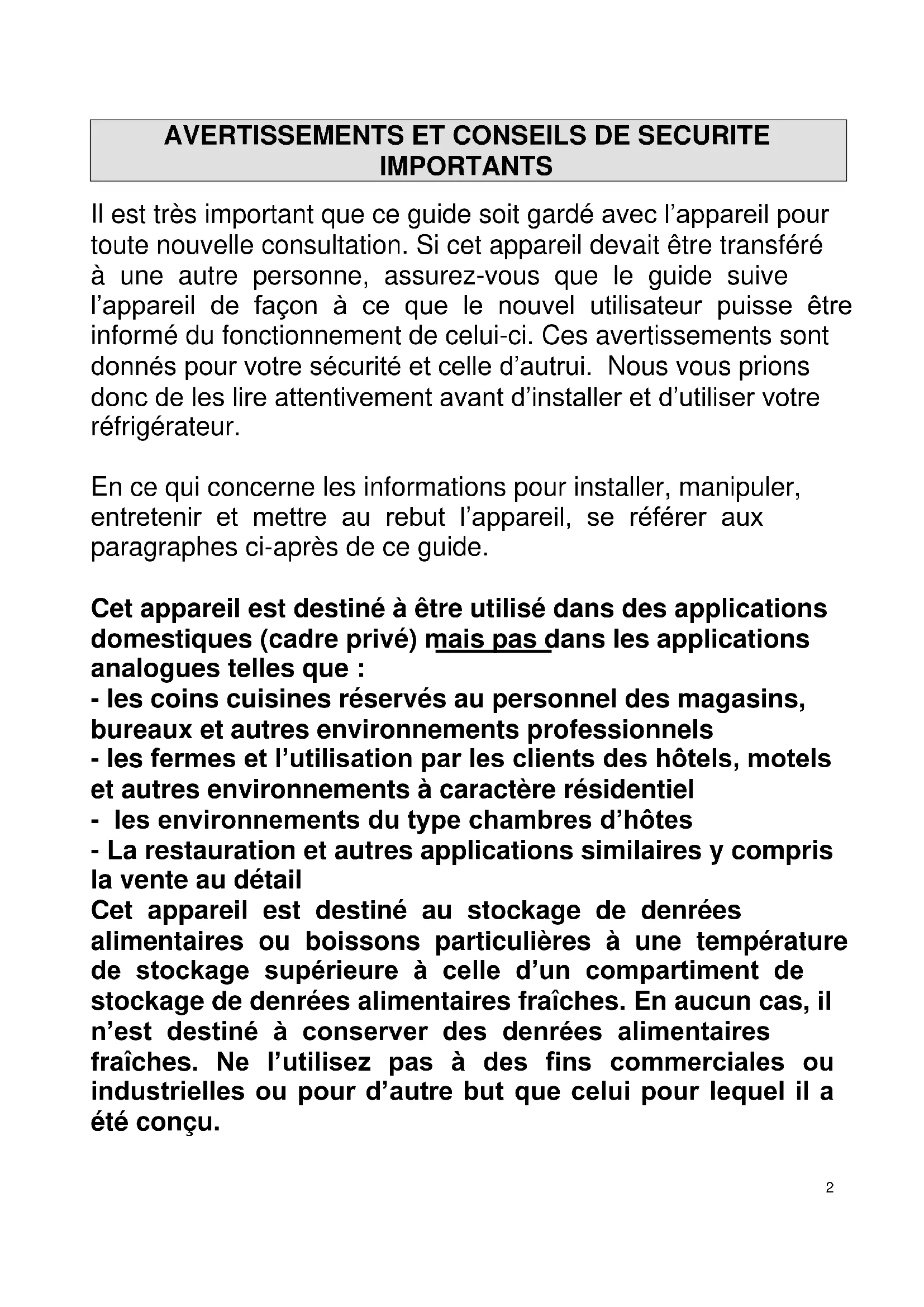 Il est très important que ce guide soit gardé avec l’appareil pour toute nouvelle consultation. Si cet appareil devait être transféré à une autre personne, assurez-vous que le guide suive l’appareil de façon à ce que le nouvel utilisateur puisse être informé du fonctionnement de celui-ci. Ces avertissements sont donnés pour votre sécurité et celle d’autrui. Nous vous prions donc de les lire attentivement avant d’installer et d’utiliser votre réfrigérateur. En ce qui concerne les informations pour installer, manipuler, entretenir et mettre au rebut l’appareil, se référer aux paragraphes ci-après de ce guide. Cet appareil est destiné à être utilisé dans des applications domestiques (cadre privé) mais pas dans les applications analogues telles que : - les coins cuisines réservés au personnel des magasins, bureaux et autres environnements professionnels - les fermes et l’utilisation par les clients des hôtels, motels et autres environnements à caractère résidentiel - les environnements du type chambres d’hôtes - La restauration et autres applications similaires y compris la vente au détail Cet appareil est destiné au stockage de denrées alimentaires ou boissons particulières à une température de stockage supérieure à celle d’un compartiment de stockage de denrées alimentaires fraîches. En aucun cas, il n’est destiné à conserver des denrées alimentaires fraîches. Ne l’utilisez pas à des fins commerciales ou industrielles ou pour d’autre but que celui pour lequel il a été conçu.3 Sécurité