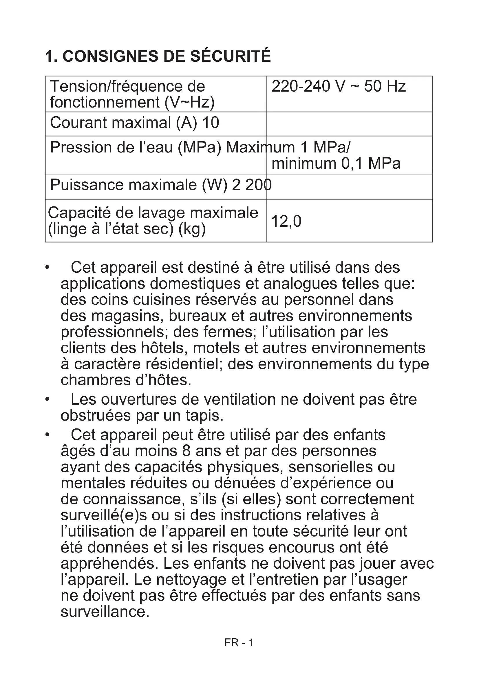 Tension/fréquence de fonctionnement (V~Hz) 220-240 V ~ 50 Hz Courant maximal (A) 10 Pression de l’eau (MPa) Maximum 1 MPa/ minimum 0,1 MPa Puissance maximale (W) 2 200 Capacité de lavage maximale (linge à l’état sec) (kg) 12,0