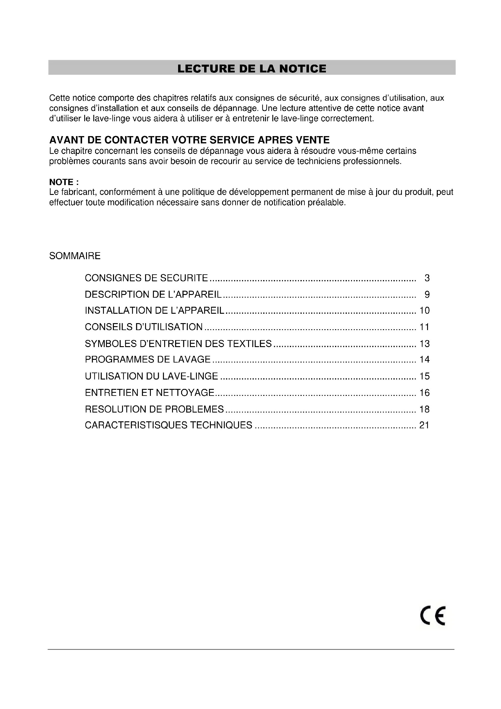 Cette notice comporte des chapitres relatifs aux consignes de sécurité, aux consignes d'utilisation, aux consignes d'installation et aux conseils de dépannage. Une lecture attentive de cette notice avant d'utiliser le lave-linge vous aidera à utiliser et à entretenir le lave-linge correctement.