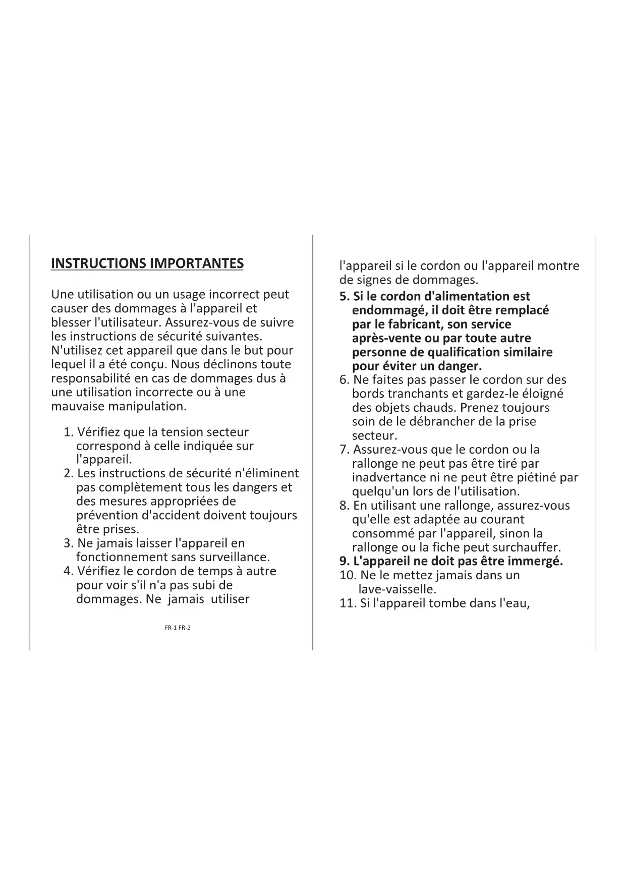 - L'appareil ne doit pas être immergé.
