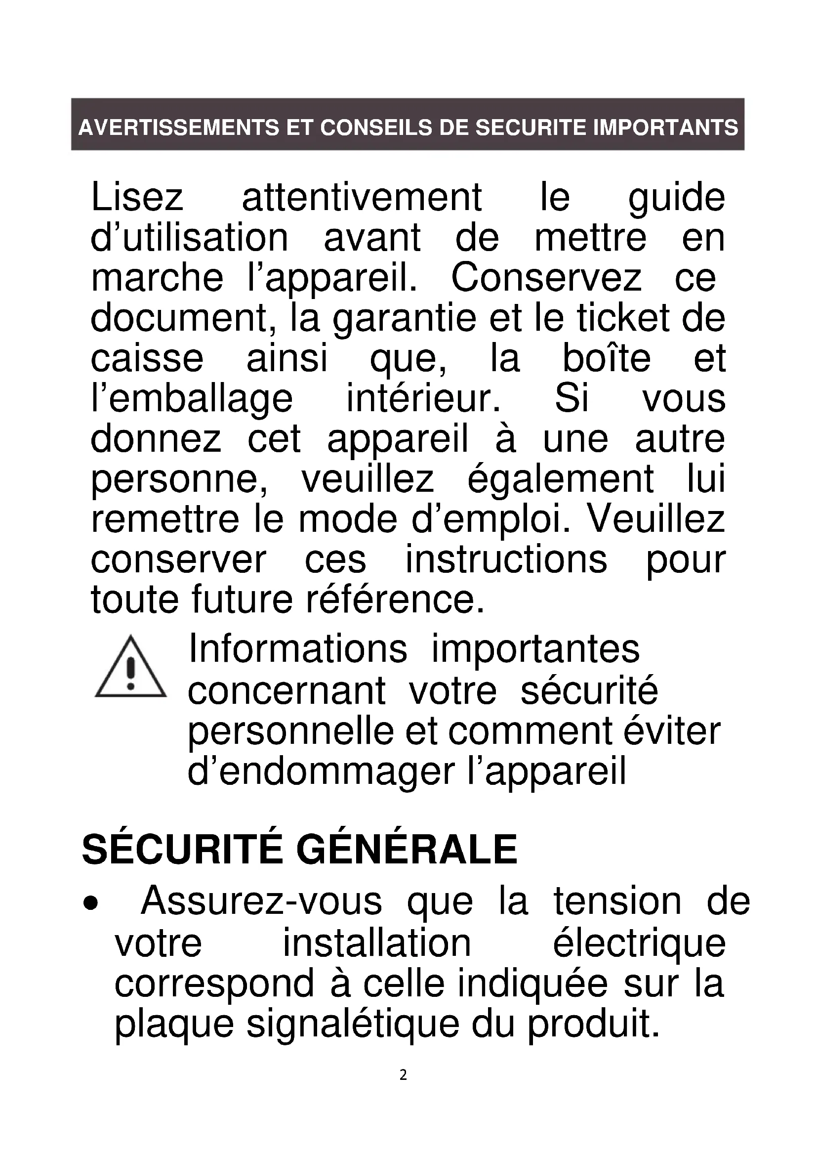 - Assurez-vous que la tension de votre installation électrique correspond à celle indiquée sur la plaque signalétique du produit.