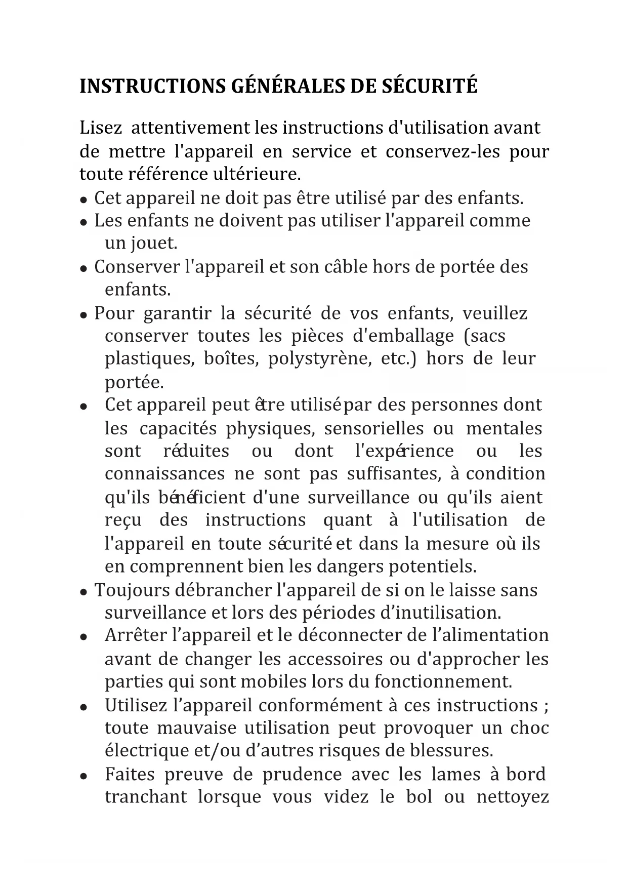 Robot pâtissier - Stand Mixer Manuel d’instructions - Instruction ManualINSTRUCTIONS GÉNÉRALES DE SÉCURITÉ Lisez attentivement les instructions d'utilisation avant de mettre l'appareil en service et conservez-les pour toute référence ultérieure. Cet appareil ne doit pas être utilisé par des enfants. Les enfants ne doivent pas utiliser l'appareil comme un jouet. Conserver l'appareil et son câble hors de portée des enfants. Pour garantir la sécurité de vos enfants, veuillez conserver toutes les pièces d'emballage (sacs plastiques, boîtes, polystyrène, etc.) hors de leur portée. Cet appareil peut être utilisé par des personnes dont les capacités physiques, sensorielles ou mentales sont réduites ou dont l'expérience ou les connaissances ne sont pas suffisantes, à condition qu'ils bénéficient d'une surveillance ou qu'ils aient reçu des instructions quant à l'utilisation de l'appareil en toute sécurité et dans la mesure où ils en comprennent bien les dangers potentiels. Toujours débrancher l'appareil de si on le laisse sans surveillance et lors des périodes d’inutilisation. Arrêter l’appareil et le déconnecter de l’alimentation avant de changer les accessoires ou d'approcher les parties qui sont mobiles lors du fonctionnement. Utilisez l’appareil conformément à ces instructions ; toute mauvaise utilisation peut provoquer un choc électrique et/ou d’autres risques de blessures. Faites preuve de prudence avec les lames à bord tranchant lorsque vous videz le bol ou nettoyezl’appareil. Si le câble d’alimentation est endommagé, il doit être remplacé par le fabricant, son service après-vente ou toute personne de qualification similaire afin d’éviter un danger. Ne pas mettre en marche le robot si le câble d’alimentation est endommagé. Cet appareil est conçu pour un usage domestique uniquement. Cet appareil n’est pas conçu pour être utilisé en plein air. N’immergez jamais le robot dans un liquide. Ne touchez ni n’utilisez pas l’appareil avec les mains mouillées. Si l'appareil est humide ou mouillé, débranchez-le immédiatement. Gardez vos doigts éloignés des pièces et accessoires en mouvement. Ne mettez pas vos doigts dans la charnière. Utilisez uniquement des pièces de rechanges d'origine. Ne rien insérer dans les accessoires lorsque le robot est en fonctionnement. Placez l’appareil sur une surface de travail lisse, plane et stable. Assurez-vous que le robot est complètement arrêté avant de lever son bras. Soyez prudent si du liquide chaud est versé dans la machine car il peut être éjecté de l'appareil en raison d'une vapeur soudaine. En ce qui concerne les instructions pour le nettoyage des surfaces en contact avec les aliments, veuillez-vous reporter à la section « NETTOYAGE ». Les instructions concernant les durées de fonctionnement et les réglages de vitesse, et ce pour chaque accessoires, sont décrites dans les pages suivantes.