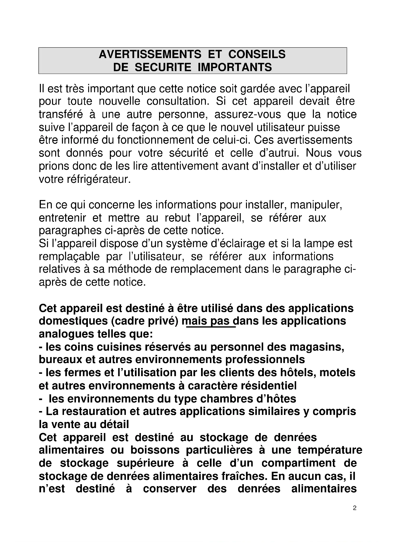 Il est très important que cette notice soit gardée avec l’appareil pour toute nouvelle consultation. Si cet appareil devait être transféré à une autre personne, assurez-vous que la notice suive l’appareil de façon à ce que le nouvel utilisateur puisse être informé du fonctionnement de celui-ci. Ces avertissements sont donnés pour votre sécurité et celle d’autrui. Nous vous prions donc de les lire attentivement avant d’installer et d’utiliser votre réfrigérateur. En ce qui concerne les informations pour installer, manipuler, entretenir et mettre au rebut l’appareil, se référer aux paragraphes ci-après de cette notice. Si l’appareil dispose d’un système d’éclairage et si la lampe est remplaçable par l’utilisateur, se référer aux informations relatives à sa méthode de remplacement dans le paragraphe ci- après de cette notice. Cet appareil est destiné à être utilisé dans des applications domestiques (cadre privé) mais pas dans les applications analogues telles que: - les coins cuisines réservés au personnel des magasins, bureaux et autres environnements professionnels - les fermes et l’utilisation par les clients des hôtels, motels et autres environnements à caractère résidentiel - les environnements du type chambres d’hôtes - La restauration et autres applications similaires y compris la vente au détail Cet appareil est destiné au stockage de denrées alimentaires ou boissons particulières à une température de stockage supérieure à celle d’un compartiment de stockage de denrées alimentaires fraîches. En aucun cas, il n’est destiné à conserver des denrées alimentaires3 fraîches. Ne l’utilisez pas à des fins commerciales ou industrielles ou pour d’autre but que celui pour lequel il a été conçu. Sécurité Cet appareil peut être utilisé par des enfants âgés d'au moins 8 ans et par des personnes ayant des capacités physiques, sensorielles ou mentales réduites ou dénuées d’expérience ou de connaissance, s'ils (si elles) sont correctement surveillé(e)s ou si des instructions relatives à l'utilisation de l'appareil en toute sécurité leur ont été données et si les risques encourus ont été appréhendés. Les enfants ne doivent pas jouer avec l’appareil. Il convient de maintenir à distance les enfants de moins de 3 ans, à moins qu'ils ne soient sous une surveillance continue. Le nettoyage et l'entretien par l'usager ne doivent pas être effectués par des enfants sans surveillance. Les enfants âgés de 3 à 8 ans sont autorisés à charger et décharger les appareils de réfrigération. Débranchez toujours la prise de courant avant de procéder à son nettoyage; de procéder à son dégivrage; de changer la lampe d’éclairage; de déplacer l’appareil ou de nettoyer le sol sous l’appareil. MISE EN GARDE : Ne pas endommager le circuit de réfrigération. MISE EN GARDE : Ne pas utiliser d'appareils électriques à l'intérieur du compartiment de stockage des denrées, à moins qu'ils ne soient du type recommandé par le fabricant. MISE EN GARDE : Ne pas utiliser de dispositifs mécanique ou autre moyens pour accélérer le processus de dégivrage autres que ceux recommandés par le fabricant. MISE EN GARDE : Maintenir dégagées les ouvertures de ventilation dans l'enceinte de l'appareil ou dans la structure d'encastrement.4 Ne pas brancher l’appareil à une prise de courant non protégée contre les surcharges (fusible). Ne jamais utiliser de prises multiples ou de rallonge pour brancher l’appareil. MISE EN GARDE : Ne pas placer de blocs multiprises ni de blocs d’alimentation portable à l’arrière de l’appareil Cet appareil n’est pas destiné à être mis en fonctionnement au moyen d'une minuterie extérieure ou par un système de commande à distance séparé ou tout autre dispositif qui met l’appareil sous tension automatiquement. Ne pas stocker dans cet appareil des substances explosives telles que des aérosols contenant des gaz propulseurs inflammables. MISE EN GARDE : lors de l’installation, s’assurer que le cordon d’alimentation n’est pas coincé ni endommagé. Après installation, vérifiez qu’il ne repose pas sur le câble d’alimentation. Si le câble d’alimentation est endommagé, il doit être remplacé par le fabricant, son service après-vente ou des personnes de qualifications similaires afin d’éviter un danger. Cet appareil est lourd ; faites attention lors d’un déplacement. Si votre appareil a été couché pendant le transport, attendre 48h avant de le mettre en fonctionnement. L’ampoule est destinée à être exclusivement utilisée dans cet appareil. L’ampoule ne convient pas pour l’éclairage d’une pièce d’un ménage. Des ouvertures de la porte de manière prolongée sont susceptibles d'entraîner une augmentation significative de température des compartiments de l'appareil. Nettoyer régulièrement les surfaces et les systèmes d'évacuation accessibles. Si l’appareil de réfrigération demeure vide de manière prolongée, le mettre hors tension, en effectuer le dégivrage, le5 nettoyer, le sécher, et laisser la porte ouverte pour prévenir le développement de moisissures à l'intérieur de l'appareil. Service - réparations Il est dangereux de modifier ou d’essayer de modifier les caractéristiques de cet appareil. En cas de panne, n’essayez pas de réparer l’appareil vous- même. Les réparations effectuées par du personnel non- qualifié peuvent provoquer des dommages. Contactez le service après-vente de votre revendeur. N’utilisez aucun outil coupant ou pointu pour dégivrer l’appareil. N’utilisez aucun appareil électrique à l’intérieur de l’appareil. Si le système de réfrigération est endommagé: N’utilisez pas de flamme près de l’appareil. Evitez les étincelles – n’allumez pas d’appareil électrique ou de lampe électrique. Ventilez immédiatement la pièce Frigorigène