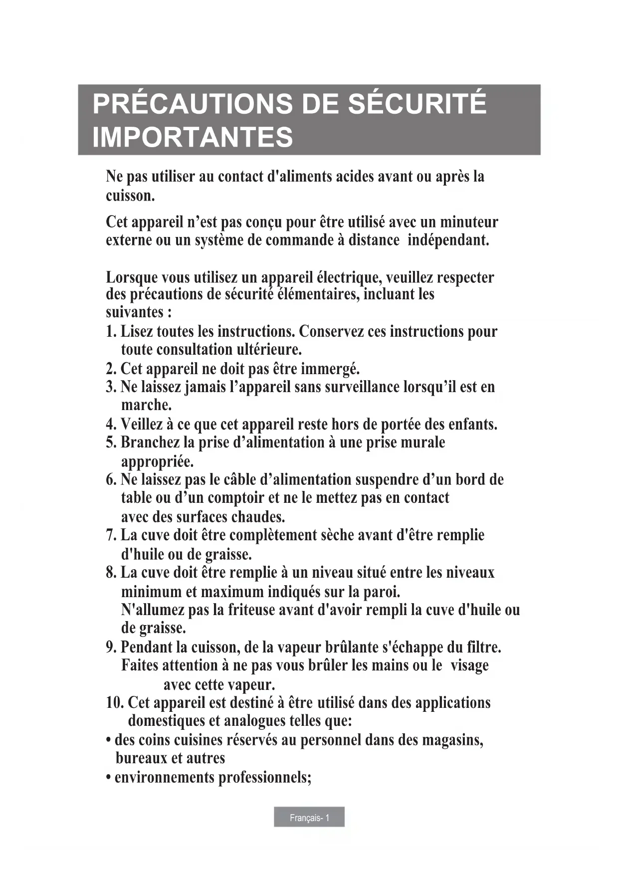 IMPORTANTES Ne pas utiliser au contact d'aliments acides avant ou après la cuisson. Cet appareil n’est pas conçu pour être utilisé avec un minuteur externe ou un système de commande à distance indépendant. Lorsque vous utilisez un appareil électrique, veuillez respecter des précautions de sécurité élémentaires, incluant les suivantes :