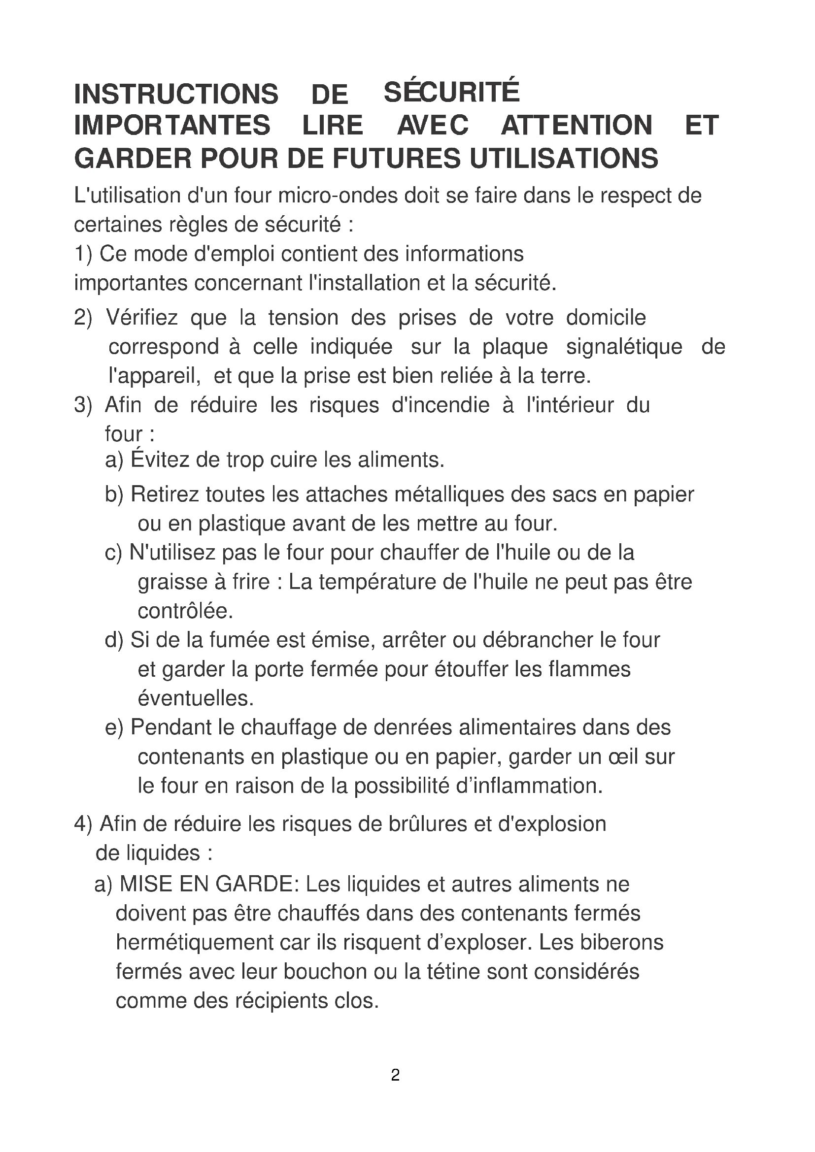 de liquides : a) MISE EN GARDE: Les liquides et autres aliments ne doivent pas être chauffés dans des contenants fermés hermétiquement car ils risquent d’exploser. Les biberons fermés avec leur bouchon ou la tétine sont considérés comme des récipients clos.3 b) Le chauffage des boissons par micro-ondes peut provoquer un jaillissement brusque et différé de liquide en ébullition, aussi des précautions doivent être prises lors de la manipulation du récipient. c) Il n’est pas recommandé de chauffer les œufs dans leur coquille et les œufs durs entiers dans un four micro-ondes car ils risquent d’exploser, même après la fin de cuisson. Les pommes de terre, les saucisses et les châtaignes doivent être épluchées ou percées avant d'aller au four micro-ondes. d) Le contenu des biberons et des pots d’aliments pour bébé doit être remué ou agité et la température doit en être vérifiée avant consommation, de façon à éviter les brûlures.