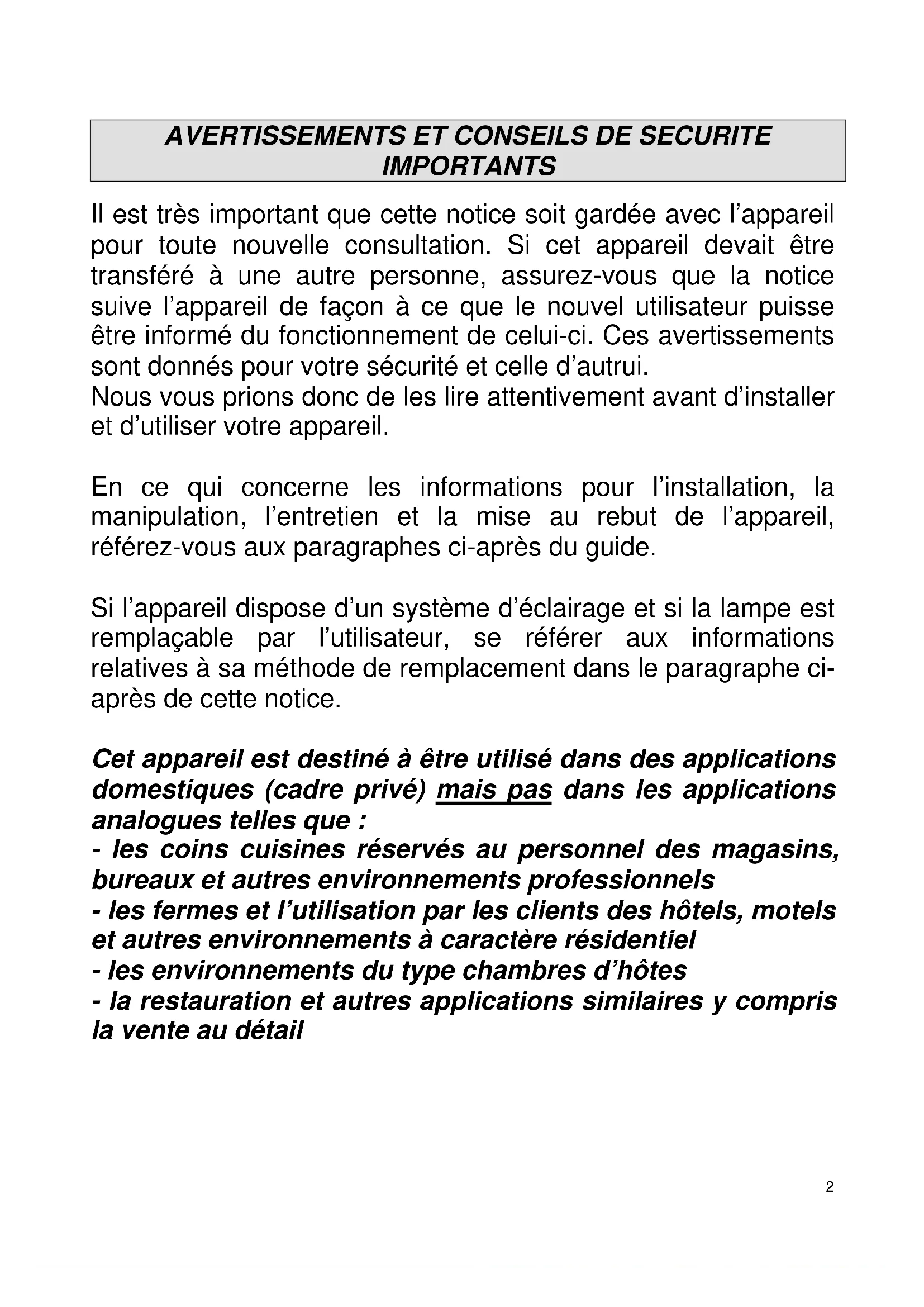 IMPORTANTS Il est très important que cette notice soit gardée avec l’appareil pour toute nouvelle consultation. Si cet appareil devait être transféré à une autre personne, assurez-vous que la notice suive l’appareil de façon à ce que le nouvel utilisateur puisse être informé du fonctionnement de celui-ci. Ces avertissements sont donnés pour votre sécurité et celle d’autrui. Nous vous prions donc de les lire attentivement avant d’installer et d’utiliser votre appareil. En ce qui concerne les informations pour l’installation, la manipulation, l’entretien et la mise au rebut de l’appareil, référez-vous aux paragraphes ci-après du guide. Si l’appareil dispose d’un système d’éclairage et si la lampe est remplaçable par l’utilisateur, se référer aux informations relatives à sa méthode de remplacement dans le paragraphe ci- après de cette notice. Cet appareil est destiné à être utilisé dans des applications domestiques (cadre privé) mais pas dans les applications analogues telles que : - les coins cuisines réservés au personnel des magasins, bureaux et autres environnements professionnels - les fermes et l’utilisation par les clients des hôtels, motels et autres environnements à caractère résidentiel - les environnements du type chambres d’hôtes - la restauration et autres applications similaires y compris la vente au détail3 Cet appareil est destiné au stockage de denrées alimentaires ou boissons particulières à une température de stockage supérieure à celle d’un compartiment de stockage de denrées alimentaires fraîches. En aucun cas, il n’est destiné à conserver des denrées alimentaires fraîches. Ne l’utilisez pas à des fins commerciales ou industrielles ou pour d’autre but que celui pour lequel il a été conçu. Sécurité Cet appareil peut être utilisé par des enfants âgés d'au moins 8 ans et par des personnes ayant des capacités physiques, sensorielles ou mentales réduites ou dénuées d’expérience ou de connaissance, s'ils (si elles) sont correctement surveillé(e)s ou si des instructions relatives à l'utilisation de l'appareil en toute sécurité leur ont été données et si les risques encourus ont été appréhendés. Les enfants ne doivent pas jouer avec l’appareil. Il convient de maintenir à distance les enfants de moins de 3 ans, à moins qu'ils ne soient sous une surveillance continue. Le nettoyage et l'entretien par l'usager ne doivent pas être effectués par des enfants sans surveillance. Les enfants âgés de 3 à 8 ans sont autorisés à charger et décharger les appareils de réfrigération. Débranchez toujours la prise de courant avant de procéder à son nettoyage ; de procéder à son dégivrage ; de changer la lampe d’éclairage ; de déplacer l’appareil ou de nettoyer le sol sous l’appareil. MISE EN GARDE : Ne pas endommager le circuit de réfrigération. MISE EN GARDE : Ne pas utiliser d'appareils électriques à l'intérieur du compartiment de stockage des denrées, à moins qu'ils ne soient du type recommandé par le fabricant.4 MISE EN GARDE : Ne pas utiliser de dispositifs mécaniques ou autre moyens pour accélérer le processus de dégivrage autres que ceux recommandés par le fabricant. MISE EN GARDE : Maintenir dégagées les ouvertures de ventilation dans l'enceinte de l'appareil ou dans la structure d'encastrement. Ne pas brancher l’appareil à une prise de courant non protégée contre les surcharges (fusible). Ne jamais utiliser de prises multiples ou de rallonge pour brancher l’appareil. MISE EN GARDE : Ne pas placer de blocs multiprises ni de blocs d’alimentation portable à l’arrière de l’appareil Cet appareil n’est pas destiné à être mis en fonctionnement au moyen d'une minuterie extérieure ou par un système de commande à distance séparé ou tout autre dispositif qui met l’appareil sous tension automatiquement. Ne pas stocker dans cet appareil des substances explosives telles que des aérosols contenant des gaz propulseurs inflammables. MISE EN GARDE : lors de l’installation, s’assurer que le cordon d’alimentation n’est pas coincé ni endommagé. Après installation, vérifiez qu’il ne repose pas sur le câble d’alimentation. Si le câble d’alimentation est endommagé, il doit être remplacé par le fabricant, son service après-vente ou des personnes de qualifications similaires afin d’éviter un danger. Cet appareil est lourd ; faites attention lors d’un déplacement. Si votre appareil a été couché pendant le transport, attendre 48h avant de le mettre en fonctionnement. Assurez-vous que l’endroit où est posé votre appareil puisse supporter le poids de celui-ci une fois chargé (1 bouteille de 75cl est environ égal à 1,3kg). L’ampoule est destinée à être exclusivement utilisée dans cet appareil.5 L’ampoule ne convient pas pour l’éclairage d’une pièce d’un ménage. Des ouvertures de la porte de manière prolongée sont susceptibles d'entraîner une augmentation significative de température des compartiments de l'appareil. Nettoyer régulièrement les surfaces et les systèmes d'évacuation accessibles. Si l’appareil de réfrigération demeure vide de manière prolongée, le mettre hors tension, en effectuer le dégivrage, le nettoyer, le sécher, et laisser la porte ouverte pour prévenir le développement de moisissures à l'intérieur de l'appareil. Service - réparations Il est dangereux de modifier ou d’essayer de modifier les caractéristiques de cet appareil. En cas de panne, n’essayez pas de réparer l’appareil vous- même. Les réparations effectuées par du personnel non- qualifié peuvent provoquer des dommages. Contactez le service après-vente de votre revendeur. Si le système de réfrigération est endommagé : N’utilisez pas de flamme près de l’appareil. Evitez les étincelles – n’allumez pas d’appareil électrique ou de lampe électrique. Ventilez 