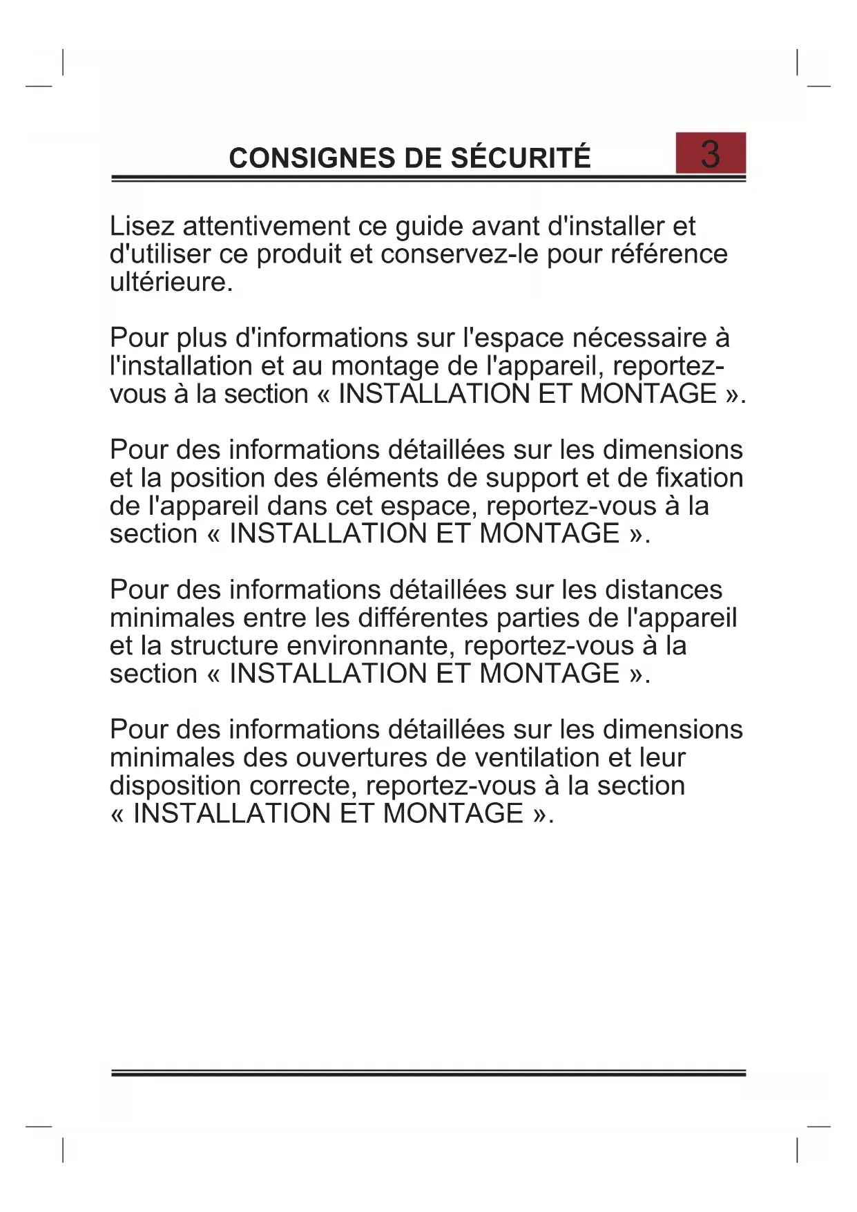 TROUVER DES INFORMATIONSLisez attentivement ce guide avant d'installer et d'utiliser ce produit et conservez-le pour référence ultérieure. Pour plus d'informations sur l'espace nécessaire à l'installation et au montage de l'appareil, reportez- vous à la section « INSTALLATION ET MONTAGE ». Pour des informations détaillées sur les dimensions et la position des éléments de support et de xation de l'appareil dans cet espace, reportez-vous à la section « INSTALLATION ET MONTAGE ». Pour des informations détaillées sur les distances minimales entre les différentes parties de l'appareil et la structure environnante, reportez-vous à la section « INSTALLATION ET MONTAGE ». Pour des informations détaillées sur les dimensions minimales des ouvertures de ventilation et leur disposition correcte, reportez-vous à la section « INSTALLATION ET MONTAGE ».