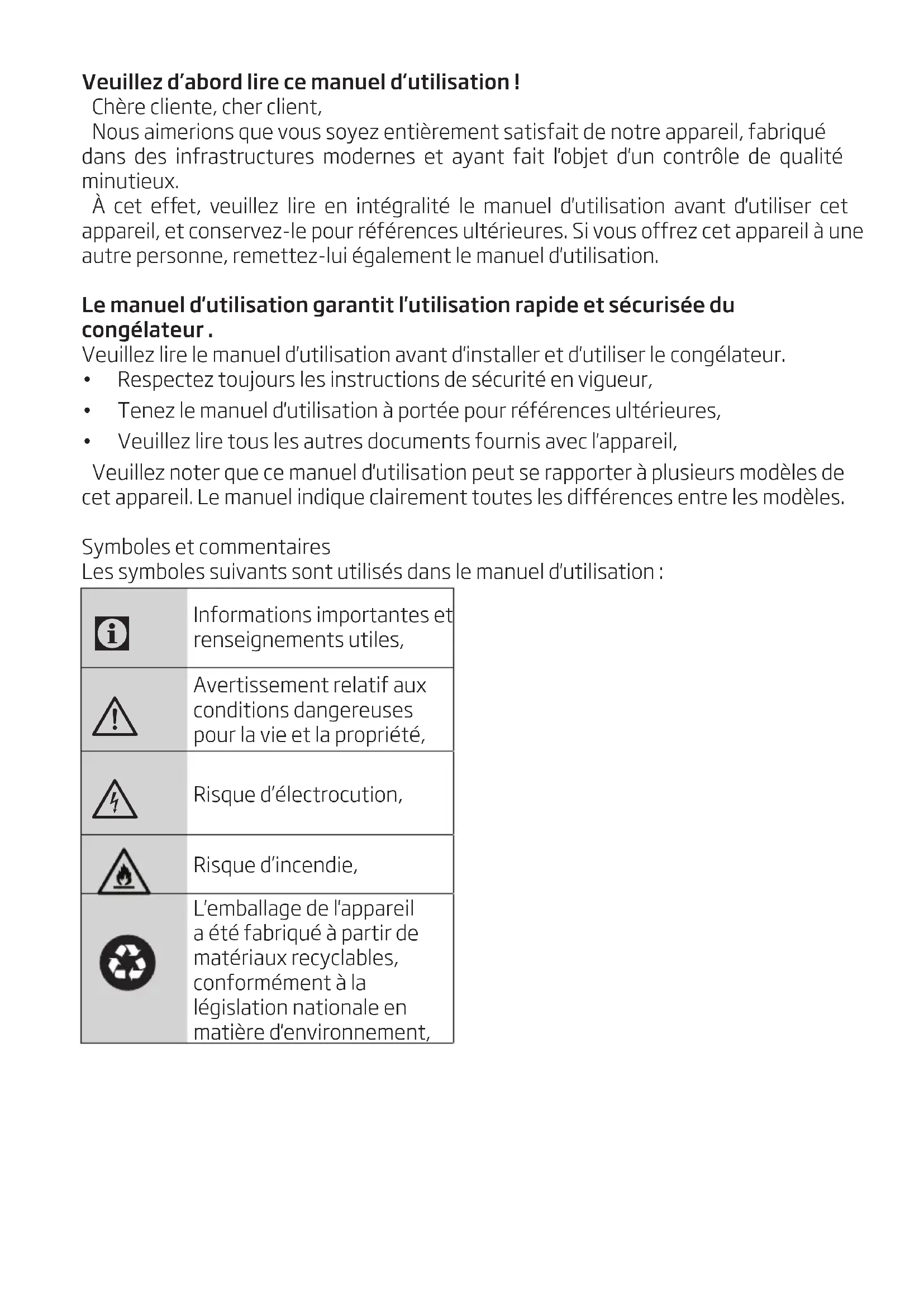 - Rsque d’électrocuton, Rsque d’ncende, L'emballage de l'apparel a été fabrqué à partr de matéraux recyclables, conformément à la légslaton natonale en matère d'envronnement,3 / 23 FR Le congélateur /Le guide d’utilisation 1 Avertissements et conseils de sécurité importants 4 Sécurité Générale p. 4