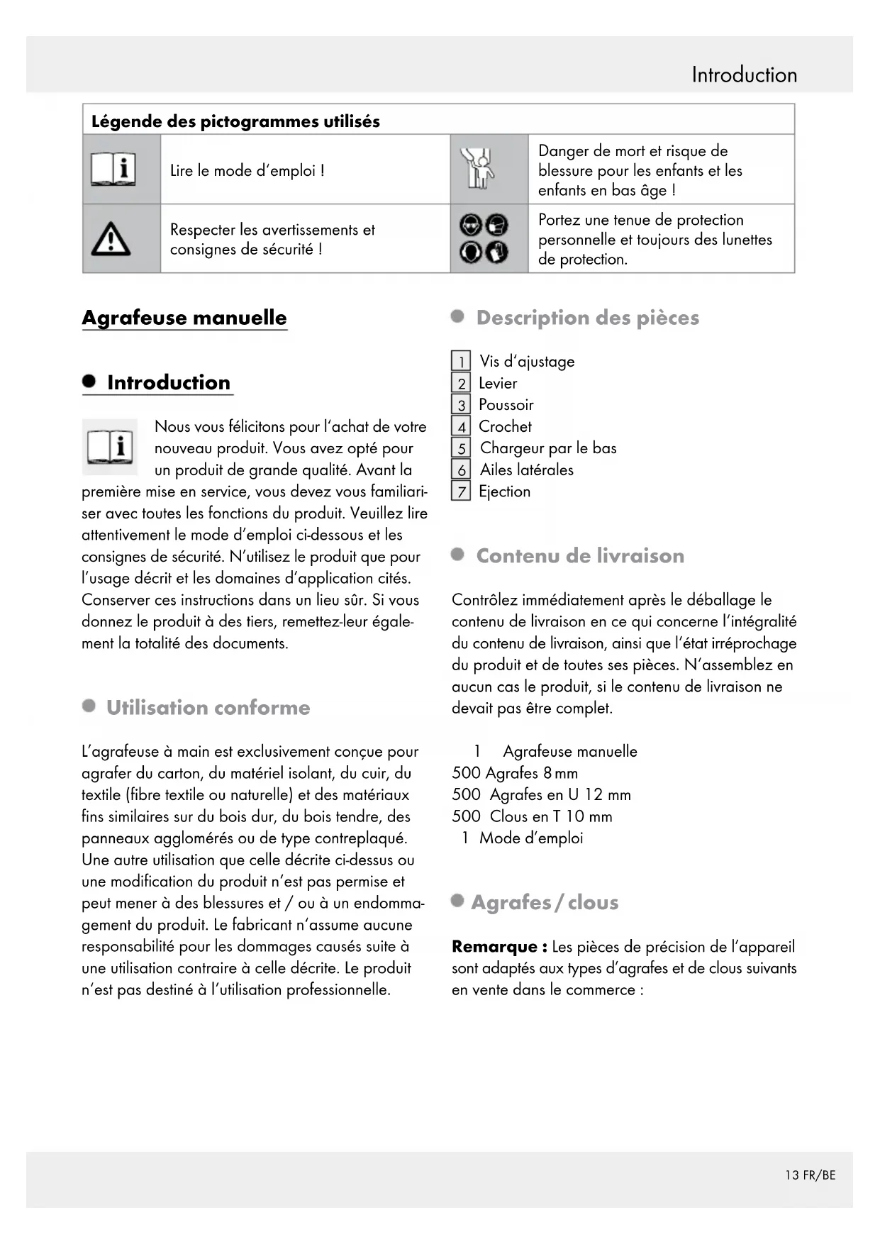 protection. Agrafeuse manuelle Introduction Nous vous félicitons pour l‘achat de votre nouveau produit. Vous avez opté pour un produit de grande qualité. Avant la première mise en service, vous devez vous familiari- ser avec toutes les fonctions du produit. Veuillez lire attentivement le mode d’emploi ci-dessous et les consignes de sécurité. N’utilisez le produit que pour l’usage décrit et les domaines d’application cités. Conserver ces instructions dans un lieu sûr. Si vous donnez le produit à des tiers, remettez-leur égale- ment la totalité des documents. Utilisation conforme L’agrafeuse à main est exclusivement conçue pour agrafer du carton, du matériel isolant, du cuir, du textile (fibre textile ou naturelle) et des matériaux fins similaires sur du bois dur, du bois tendre, des panneaux agglomérés ou de type contreplaqué. Une autre utilisation que celle décrite ci-dessus ou une modification du produit n‘est pas permise et peut mener à des blessures et / ou à un endomma- gement du produit. Le fabricant n‘assume aucune responsabilité pour les dommages causés suite à une utilisation contraire à celle décrite. Le produit n‘est pas destiné à l‘utilisation professionnelle. Description des pièces