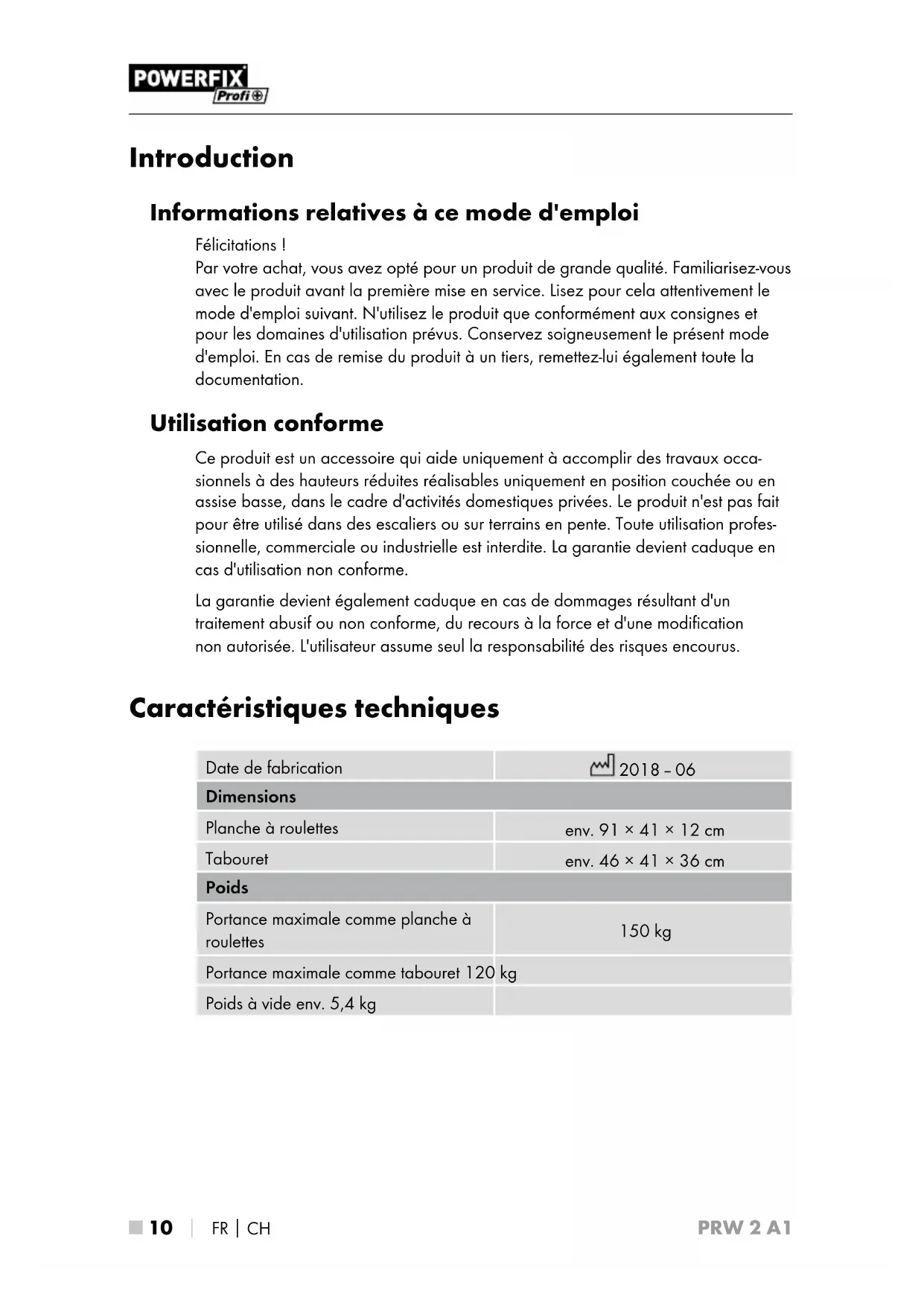 PRW 2 A1 Introduction Informations relatives à ce mode d'emploi Félicitations! Par votre achat, vous avez opté pour un produit de grande qualité. Familiarisez-vous avec le produit avant la première mise en service. Lisez pour cela attentivement le mode d'emploi suivant. N'utilisez le produit que conformément aux consignes et pour les domaines d'utilisation prévus. Conservez soigneusement le présent mode d'emploi. En cas de remise du produit à un tiers, remettez-lui également toute la documentation. Utilisation conforme Ce produit est un accessoire qui aide uniquement à accomplir des travaux occa- sionnels à des hauteurs réduites réalisables uniquement en position couchée ou en assise basse, dans le cadre d'activités domestiques privées. Le produit n'est pas fait pour être utilisé dans des escaliers ou sur terrains en pente. Toute utilisation profes- sionnelle, commerciale ou industrielle est interdite. La garantie devient caduque en cas d'utilisation non conforme. La garantie devient également caduque en cas de dommages résultant d'un traitement abusif ou non conforme, du recours à la force et d'une modification non autorisée. L'utilisateur assume seul la responsabilité des risques encourus. Caractéristiques techniques Date de fabrication 2018 – 06 Dimensions Planche à roulettes env. 91 × 41 × 12 cm Tabouret env. 46 × 41 × 36 cm Poids Portance maximale comme planche à roulettes 150kg Portance maximale comme tabouret 120kg Poids à vide env. 5,4kgFR