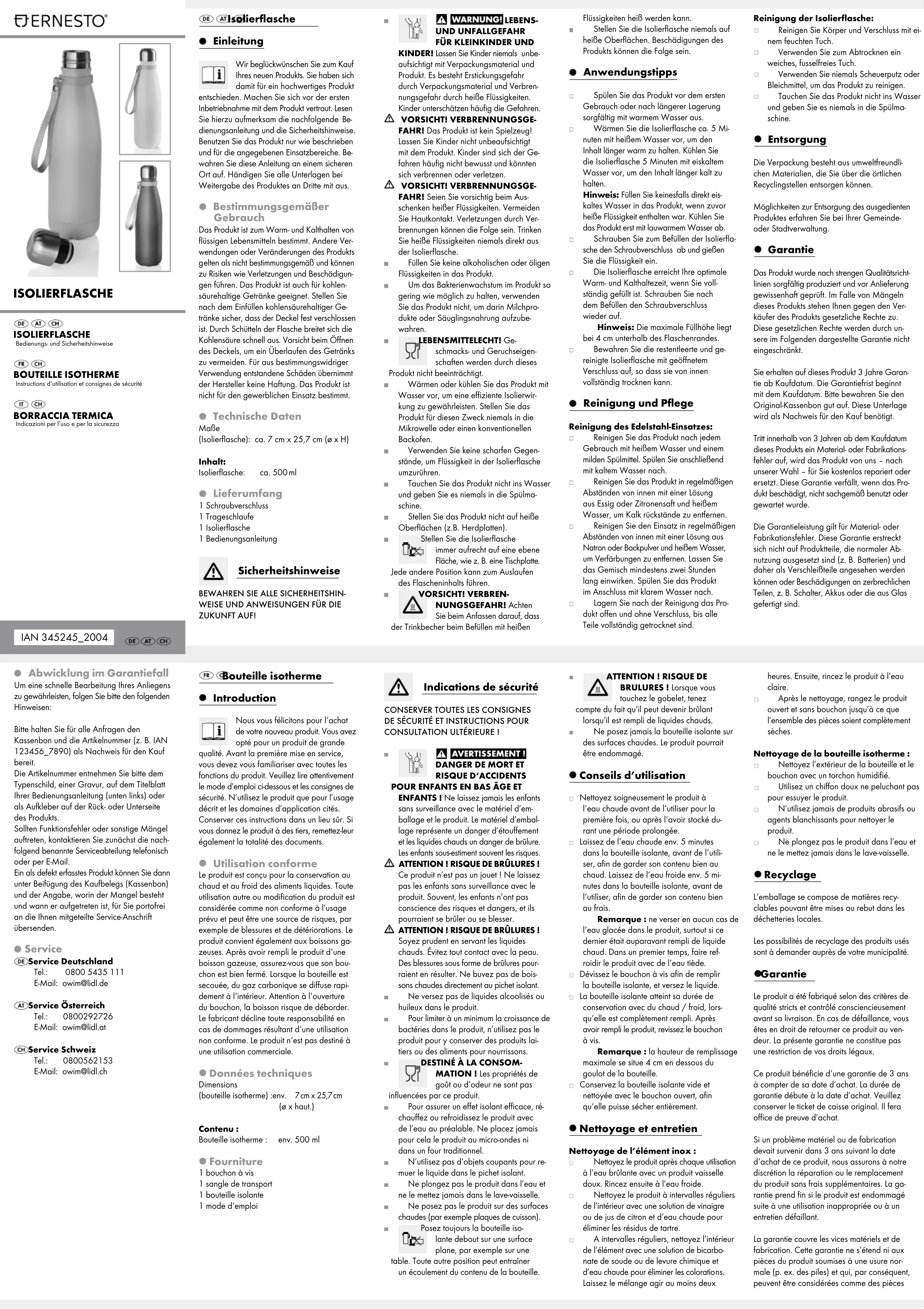 MATION ! Les propriétés de goût ou d’odeur ne sont pas influencées par ce produit. Pour assurer un effet isolant efficace, ré- chauffez ou refroidissez le produit avec de l’eau au préalable. Ne placez jamais pour cela le produit au micro-ondes ni dans un four traditionnel. N’utilisez pas d’objets coupants pour re- muer le liquide dans le pichet isolant. Ne plongez pas le produit dans l’eau et ne le mettez jamais dans le lave-vaisselle. Ne posez pas le produit sur des surfaces chaudes (par exemple plaques de cuisson). Posez toujours la bouteille iso- lante debout sur une surface plane, par exemple sur une table. Toute autre position peut entraîner un écoulement du contenu de la bouteille. Bouteille isotherme Introduction Nous vous félicitons pour l‘achat de votre nouveau produit. Vous avez opté pour un produit de grande qualité. Avant la première mise en service, vous devez vous familiariser avec toutes les fonctions du produit. Veuillez lire attentivement le mode d’emploi ci-dessous et les consignes de sécurité. N’utilisez le produit que pour l’usage décrit et les domaines d’application cités. Conserver ces instructions dans un lieu sûr. Si vous donnez le produit à des tiers, remettez-leur également la totalité des documents. Utilisation conforme Le produit est conçu pour la conservation au chaud et au froid des aliments liquides. Toute utilisation autre ou modification du produit est considérée comme non conforme à l’usage prévu et peut être une source de risques, par exemple de blessures et de détériorations. Le produit convient également aux boissons ga- zeuses. Après avoir rempli le produit d‘une boisson gazeuse, assurez-vous que son bou- chon est bien fermé. Lorsque la bouteille est secouée, du gaz carbonique se diffuse rapi- dement à l‘intérieur. Attention à l‘ouverture du bouchon, la boisson risque de déborder. Le fabricant décline toute responsabilité en cas de dommages résultant d‘une utilisation non conforme. Le produit n‘est pas destiné à une utilisation commerciale. Données techniques Dimensions (bouteille isotherme): env. 7 cm x 25,7 cm (ø x haut.) Contenu: Bouteille isotherme: env. 500 ml Fourniture 1 bouchon à vis 1 sangle de transport 1 bouteille isolante 1 mode d‘emploi Abwicklung im Garantiefall Um eine schnelle Bearbeitung Ihres Anliegens zu gewährleisten, folgen Sie bitte den folgenden Hinweisen: Bitte halten Sie für alle Anfragen den Kassenbon und die Artikelnummer (z. B. IAN 123456_7890) als Nachweis für den Kauf bereit. Die Artikelnummer entnehmen Sie bitte dem Typenschild, einer Gravur, auf dem Titelblatt Ihrer Bedienungsanleitung (unten links) oder als Aufkleber auf der Rück- oder Unterseite des Produkts. Sollten Funktionsfehler oder sonstige Mängel auftreten, kontaktieren Sie zunächst die nach- folgend benannte Serviceabteilung telefonisch oder per E-Mail. Ein als defekt erfasstes Produkt können Sie dann unter Beifügung des Kaufbelegs (Kassenbon) und der Angabe, worin der Mangel besteht und wann er aufgetreten ist, für Sie portofrei an die Ihnen mitgeteilte Service-Anschrift übersenden. Service Service Deutschland Tel.: 0800 5435 111 E-Mail: owim@lidl.de Service Österreich Tel.: 0800 292726 E-Mail: owim@lidl.at Service Schweiz Tel.: 0800562153 E-Mail: owim@lidl.ch Reinigung der Isolierflasche: Reinigen Sie Körper und Verschluss mit ei- nem feuchten Tuch. Verwenden Sie zum Abtrocknen ein weiches, fusselfreies Tuch. Verwenden Sie niemals Scheuerputz oder Bleichmittel, um das Produkt zu reinigen. Tauchen Sie das Produkt nicht ins Wasser und geben Sie es niemals in die Spülma- schine. Entsorgung Die Verpackung besteht aus umweltfreundli- chen Materialien, die Sie über die örtlichen Recyclingstellen entsorgen können. Möglichkeiten zur Entsorgung des ausgedient
