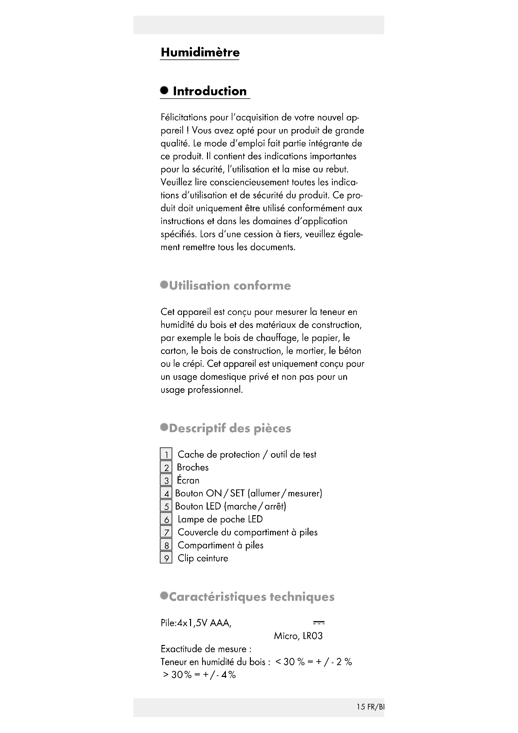 Cet appareil est conçu pour mesurer la teneur en humidité du bois et des matériaux de construction, par exemple le bois de chauffage, le papier, le carton, le bois de construction, le mortier, le béton ou le crépi. Cet appareil est uniquement conçu pour un usage domestique privé et non pas pour un usage professionnel.
