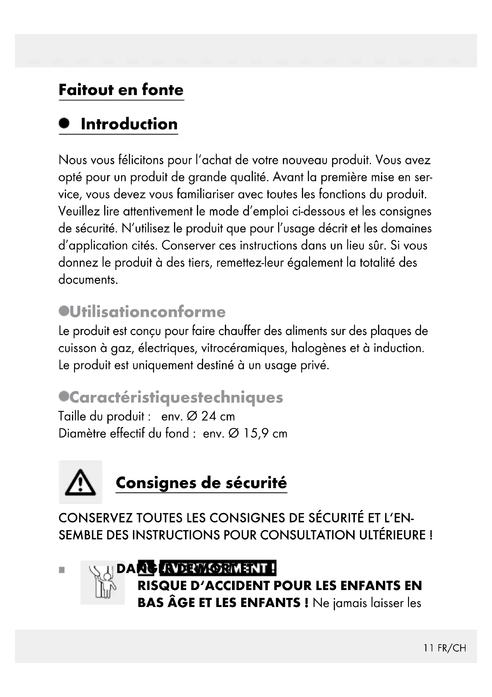 Remarque relative aux cuisinières à induction Remarque : Dans certaines circonstances, un bruit peut se pro- duire pouvant être causé par les propriétés électromagnétiques de la source de chaleur et du produit.14 FR/CH Ceci est tout à fait normal et n‘indique en rien une défaillance de vos plaques à induction ou du produit. Le produit doit être placé au centre de la plaque à induction. ATTENTION! Vitesse d‘échauffement élevée ! Ne pas surchauffer le produit lors du préchauffage. La pièce doit être aérée à fond en cas de surchauffe du produit. Utilisation Avant la première utilisation, veuillez décoller les éventuelles étique ttes adhésives du produit et le rincer à l’eau chaude. Avant la première utilisation, faites bouillir 2 à 3 fois de l‘eau dans le produit pour éliminer complètement les éventuels résidus de pro- duction. Graissez légèrement le produit. Ne pas surchauffer le produit vide ou contenant des aliments à cuire, car le pouvoir anti-adhérent pourrait alors diminuer ou le revêtement être endommagé. Chauffez les aliments à cuire à grand feu / feu moyen, et terminez la cuisson à feu doux. Traitement des déchets L‘emballage et son matériel sont exclusivement composés de matières écologiques. Les matériaux peuvent être recyclés dans les points de collecte locaux. Les possibilités de recyclage des produits usés sont à demander auprès de votre municipalité.15 FR/CH Garantie Le produit a été fabriqué selon des critères de qualité stricts et contrôlé consciencieusement avant sa livraison. En cas de défaillance, vous êtes en droit de retourner ce produit au vendeur. La présente garantie ne constitue pas une restriction de vos droits légaux. Ce produit bénéficie d‘une garantie de 3 ans à compter de sa date d’achat. La durée de garantie débute à la date d’achat. Veuillez conserver le ticket de caisse original. Il fera office de preuve d’achat. Si un problème matériel ou de fabrication devait survenir dans 3 ans suivant la date d‘achat de ce produit, nous assurons à notre discrétion la réparation ou le remplacement du produit sans frais supplémen- taires. La garantie prend fin si le produit est endommagé suite à une utilisation inappropriée ou à un entretien défaillant. La garantie couvre les vices matériels et de fabrication. Cette garantie ne s’étend ni aux pièces du produit soumises à une usure normale (p. ex. des piles) et qui, par conséquent, peuvent être considérées comme des pièces d’usure, ni aux dommages sur des composants fragiles, comme des interrupteurs, des batteries ou des éléments fabriqués en verre. Faire valoir sa garantie Pour garantir la rapidité d’exécution de la procédure de garantie, veuillez respecter les indications suivantes : Veuillez conserver le ticket de caisse et la référence du produit (par ex. IAN 123456_7890) à titre de preuve d’achat pour toute demande.16 FR/CH Le numéro de référence de l’article est indiqué sur la plaque d’identifi- cation, gravé sur la page de titre de votre manuel (en bas à gauche) ou sur un autocollant apposé sur la face arrière ou inférieure du produit. En cas de dysfonctionnement du produit, ou de tout autre défaut, contactez en premier lieu le service après-vente par téléphone ou par e-mail aux coordonnées indiquées ci-dessous. Vous pouvez alors envoyer franco de port tout produit considéré comme défectueux au service clientèle indiqué, accompagné de la preuve d’achat (ticket de caisse) et d’une description écrite du défaut avec mention de sa date d’apparition. Service après-vente Service après-vente France Tél. : 0800904879 E-Mail : owim@lidl.fr Service après-vente Suisse Tél. : 0800562153 E-Mail : owim@lidl.ch17 IT/CH Introduzione ..................................................................Pagina 18 Utilizzo secondo la destinazione d’uso .............................. Pagina 18 Dati tecnici ............................................................................Pagina 18 Consigli per la sicurezza ...................................... Pagina 18 Avvertenze per fornelli a induzione .........Pagina 20 Utilizzo ................................................................................Pagina 21 Smaltimento ................................................................... Pagina 21 Garanzia ........................................................................... Pagina 21 Gestione dei casi in garanzia .............................................Pagina 22 Assistenza .............................................................................Pagina 2318 IT/CH Pentola Introduzione Congratulazioni per l‘acquisto del vostro nuovo prodotto. Con esso avete optato per un prodotto di qualità. Familiarizzare con il prodotto prima di metterlo in funzione per la prima volta. A tale scopo, leggere attentamente le seguenti istruzioni d‘uso e le avvertenze di sicurezza. Utilizzare il prodotto solo come descritto e per i campi di applicazione indicati. Conservare queste istruzioni in un luogo sicuro. Consegnare tutta la documentazione in caso di cessione del prodotto a terzi. Utilizzo secondo la destinazione d’uso Il prodotto è destinato al riscaldamento di alimenti su fornelli a gas, elettrici, in vetroceramica, alogeni e a induzione. Il prodotto è destinato esclusivamente all‘uso privato. Dati tecnici Dimensioni del prodotto: ca. Ø 24 cm Diametro utile della base: ca. Ø 15,9 cm Consigli per la sicurezza CONSERVARE TUTTE LE INDICAZIONI DI SICUREZZA E LE AVVER- TENZE PER EVENTUALI CONSULTAZIONI FUTURE!