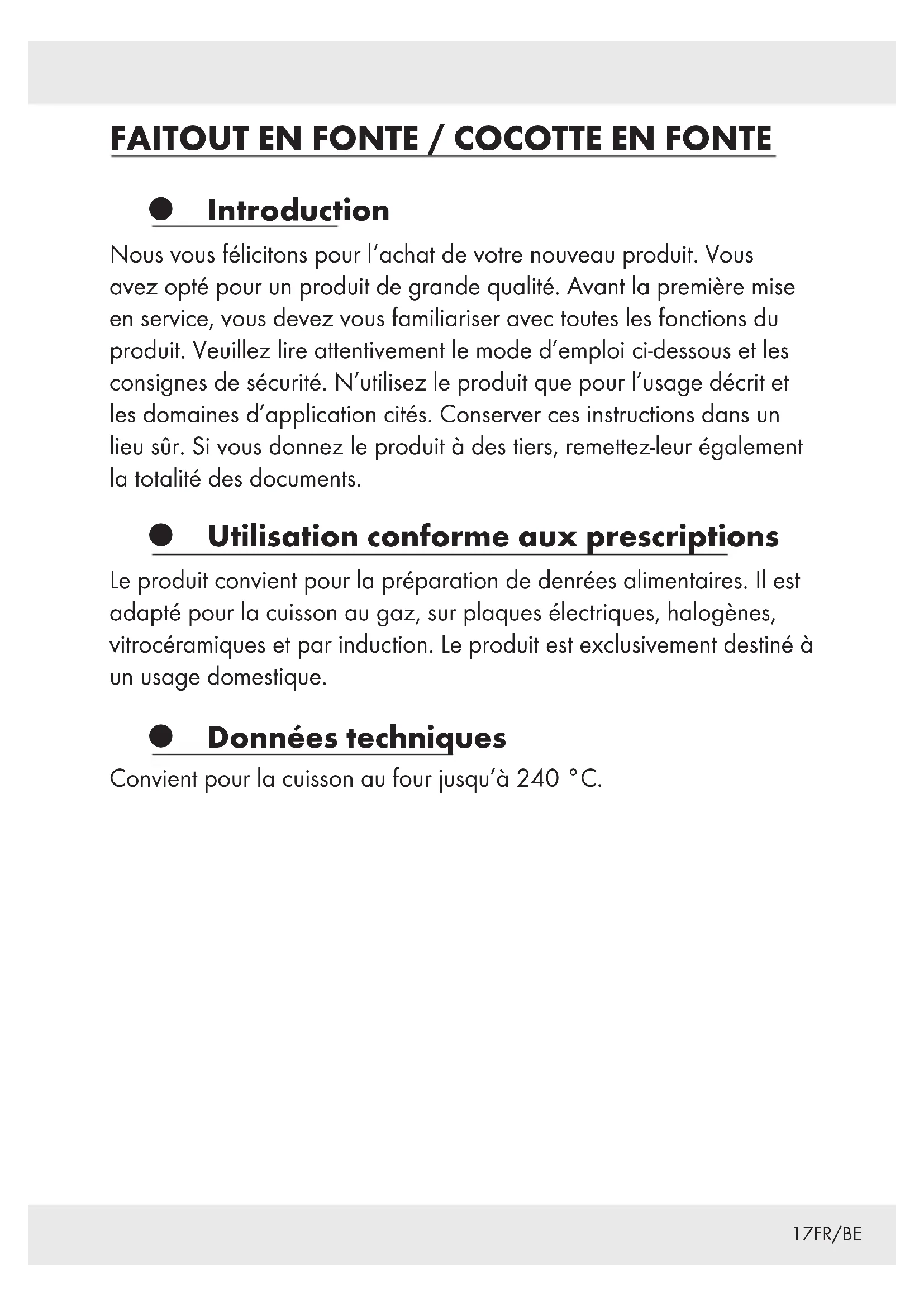 Introduction Nous vous félicitons pour l‘achat de votre nouveau produit. Vous avez opté pour un produit de grande qualité. Avant la première mise en service, vous devez vous familiariser avec toutes les fonctions du produit. Veuillez lire attentivement le mode d’emploi ci-dessous et les consignes de sécurité. N’utilisez le produit que pour l’usage décrit et les domaines d’application cités. Conserver ces instructions dans un lieu sûr. Si vous donnez le produit à des tiers, remettez-leur également la totalité des documents. Utilisation conforme aux prescriptions Le produit convient pour la préparation de denrées alimentaires. Il est adapté pour la cuisson au gaz, sur plaques électriques, halogènes, vitrocéramiques et par induction. Le produit est exclusivement destiné à un usage domestique. Données techniques Convient pour la cuisson au four jusqu’à 240 °C.18 FR/BE Consignes de sécurité CONSERVEZ TOUTES LES CONSIGNES DE SÉCURITÉ ET INSTRUCTIONS POUR VOUS Y REPORTER ULTÉRIEUREMENT!