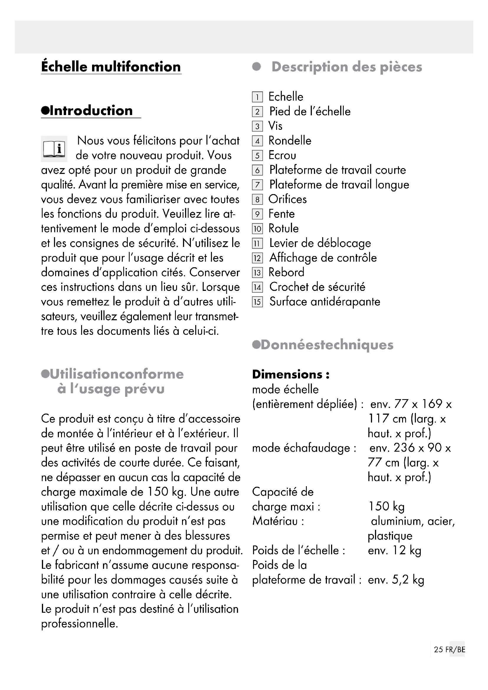 Surface antidérapante Données techniques Dimensions: mode échelle (entièrement dépliée): env. 77 x 169 x 117 cm (larg. x haut. x prof.) mode échafaudage: env. 236 x 90 x 77 cm (larg. x haut. x prof.) Capacité de charge maxi: 150 kg Matériau: aluminium, acier, plastique Poids de l‘échelle : env. 12 kg Poids de la plateforme de travail : env. 5,2 kg26 FR/BE Fourniture 1 échelle multifonctions 2 pieds 4 vis 4 rondelles 4 écrous 2 plateformes de travail 1 mode d’emploi Consignes de sécurité Consignes de sécurité générales