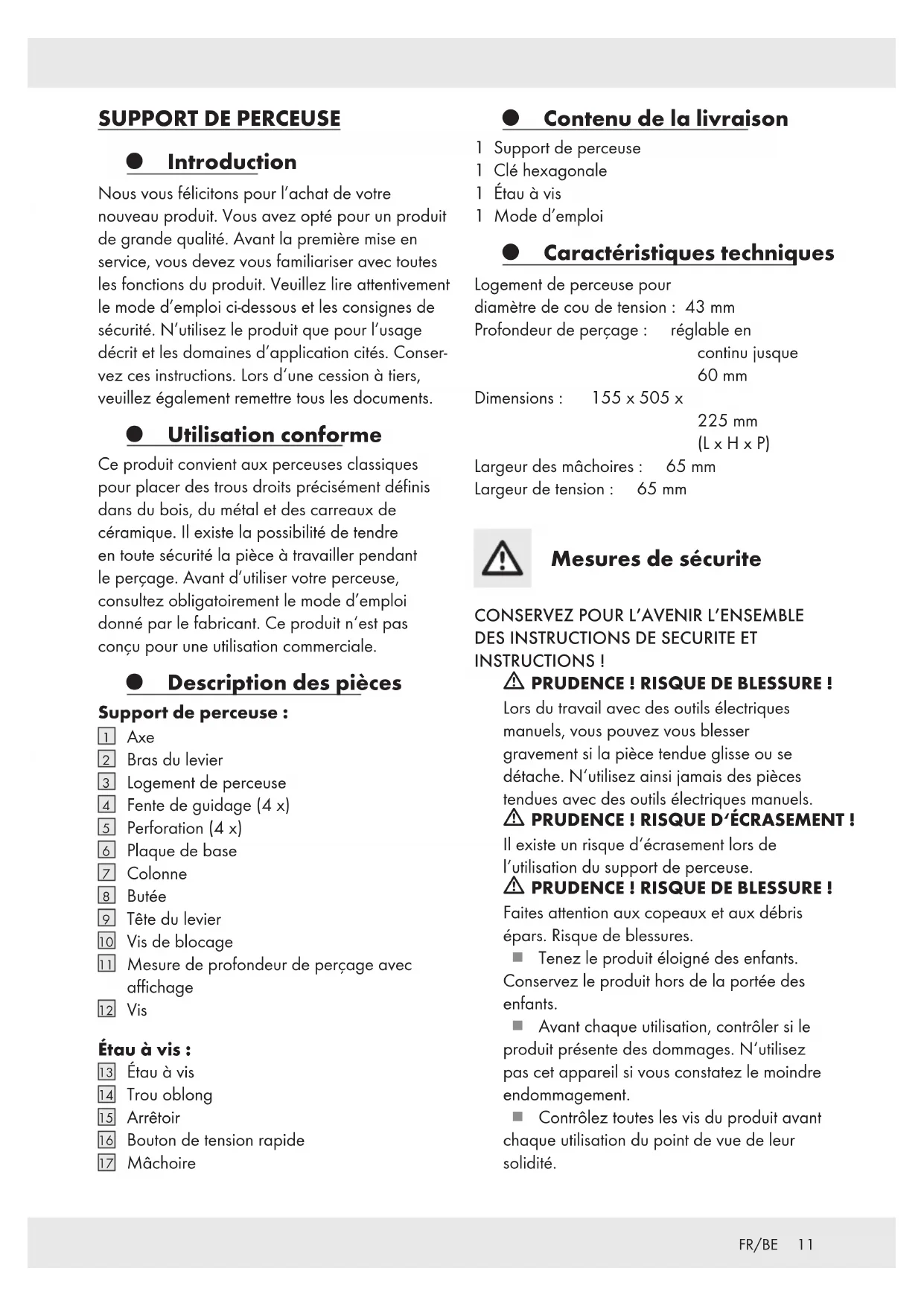 INSTRUCTIONS! m PRUDENCE! RISQUE DE BLESSURE! Lors du travail avec des outils électriques manuels, vous pouvez vous blesser gravement si la pièce tendue glisse ou se détache. N‘utilisez ainsi jamais des pièces tendues avec des outils électriques manuels. m PRUDENCE! RISQUE D‘ÉCRASEMENT ! Il existe un risque d‘écrasement lors de l‘utilisation du support de perceuse. m PRUDENCE! RISQUE DE BLESSURE! Faites attention aux copeaux et aux débris épars. Risque de blessures. Tenez le produit éloigné des enfants. Conservez le produit hors de la portée des enfants. Avant chaque utilisation, contrôler si le produit présente des dommages. N‘utilisez pas cet appareil si vous constatez le moindre endommagement. Contrôlez toutes les vis du produit avant chaque utilisation du point de vue de leur solidité.12 FR/BE Utilisez le produit sur une surface stable, plane et non endommagée (par ex. un banc d‘atelier). Débranchez toujours la perceuse du secteur avant les travaux de réglage et en cas de pause. Pour garantir un travail sûr, le support de perceuse doit être monté sur un banc d‘atelier ou sur un support stable ne pouvant pas basculer. Pour cela, utilisez les perforations