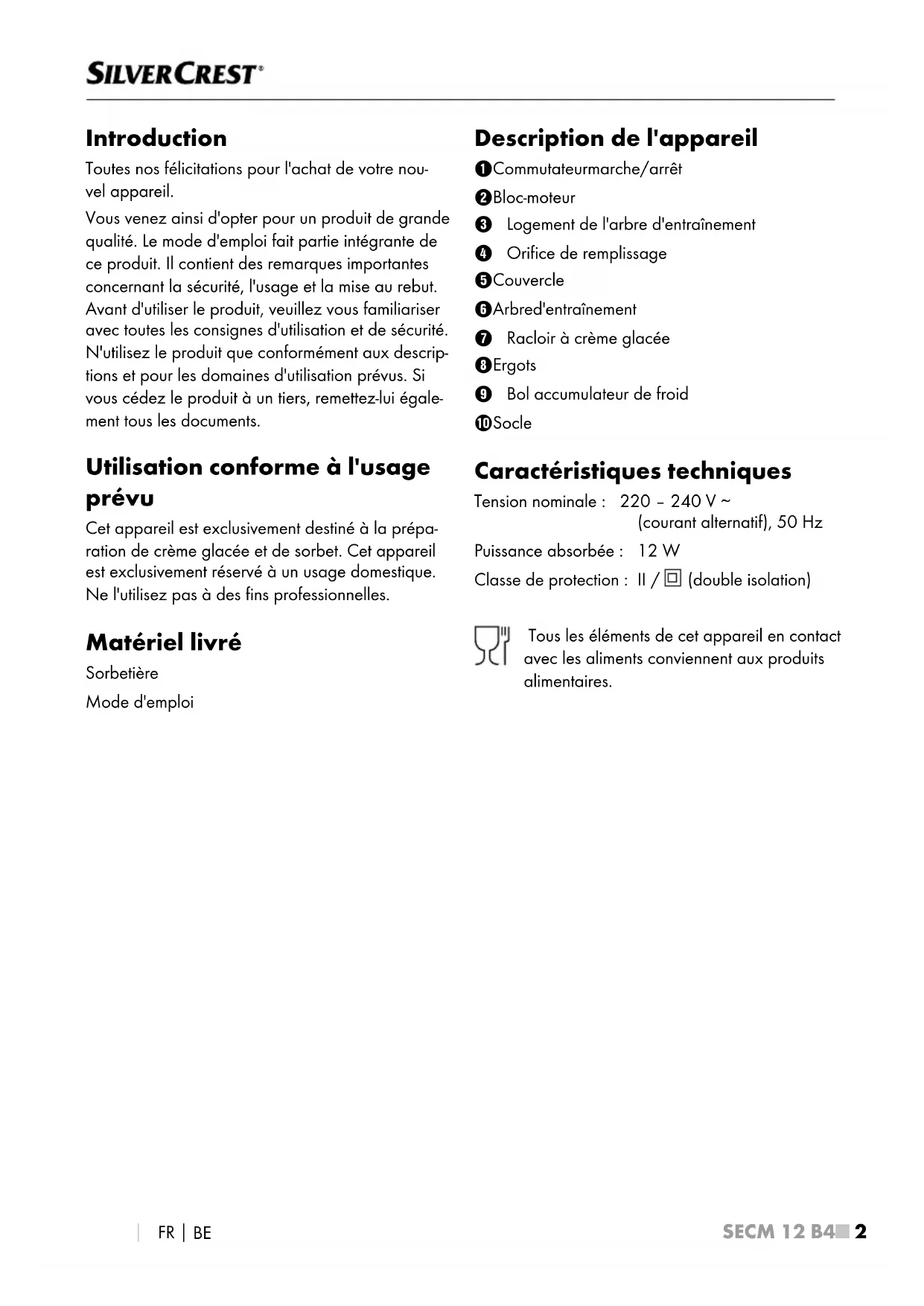 Introduction Toutes nos félicitations pour l'achat de votre nou- vel appareil. Vous venez ainsi d'opter pour un produit de grande qualité. Le mode d'emploi fait partie intégrante de ce produit. Il contient des remarques importantes concernant la sécurité, l'usage et la mise au rebut. Avant d'utiliser le produit, veuillez vous familiariser avec toutes les consignes d'utilisation et de sécurité. N'utilisez le produit que conformément aux descrip- tions et pour les domaines d'utilisation prévus. Si vous cédez le produit à un tiers, remettez-lui égale- ment tous les documents. Utilisation conforme à l'usage prévu Cet appareil est exclusivement destiné à la prépa- ration de crème glacée et de sorbet. Cet appareil est exclusivement réservé à un usage domestique. Ne l'utilisez pas à des fins professionnelles. Matériel livré Sorbetière Mode d'emploi Description de l'appareil 1 Commutateur marche/arrêt 2 Bloc-moteur 3 Logement de l'arbre d'entraînement 4 Orifice de remplissage 5 Couvercle 6 Arbre d'entraînement 7 Racloir à crème glacée 8 Ergots 9 Bol accumulateur de froid 0 Socle Caractéristiques techniques Tension nominale: 220 – 240 V ∼ (courant alternatif), 50 Hz Puissance absorbée: 12 W Classe de protection: II / (double isolation) Tous les éléments de cet appareil en contact avec les aliments conviennent aux produits alimentaires.SECM 12 B4