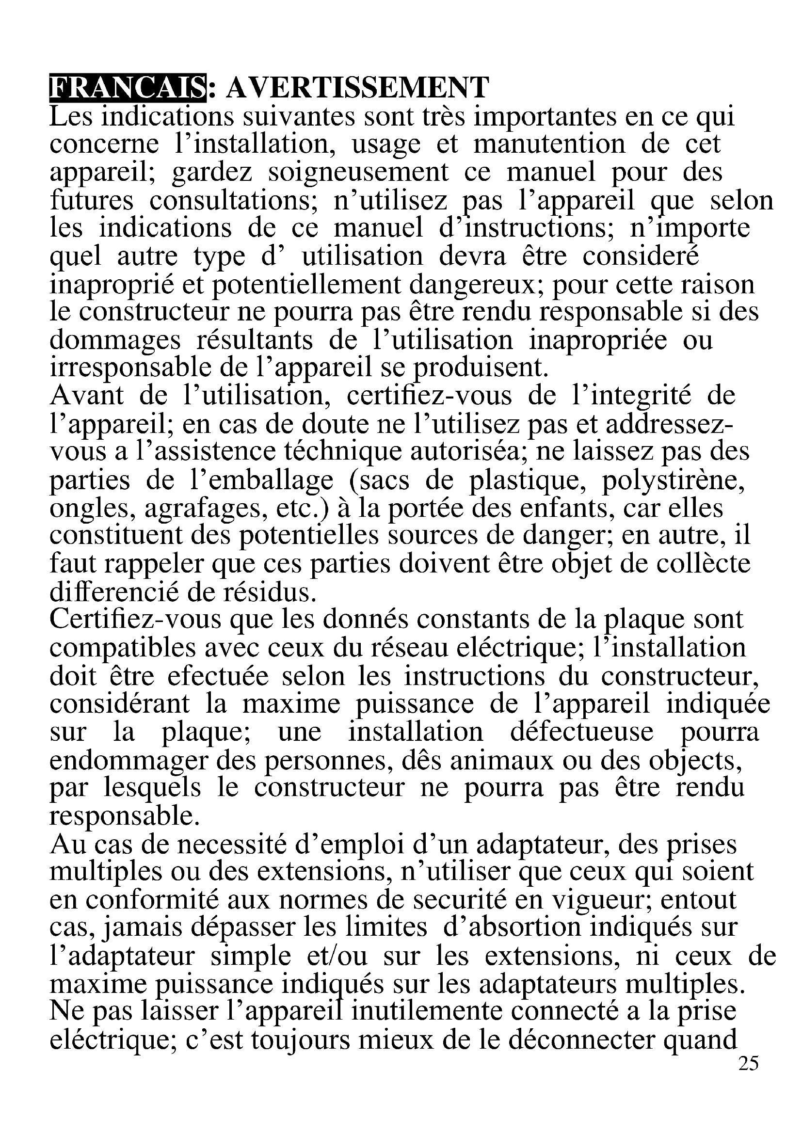 - 3 Temperaturen, 2 Geschwindigkeitsstufen, Kaltes Luft25 FRANCAIS: AVERTISSEMENT Les indications suivantes sont très importantes en ce qui concerne l’installation, usage et manutention de cet appareil; gardez soigneusement ce manuel pour des futures consultations; n’utilisez pas l’appareil que selon les indications de ce manuel d’instructions; n’importe quel autre type d’ utilisation devra être consideré inaproprié et potentiellement dangereux; pour cette raison le constructeur ne pourra pas être rendu responsable si des dommages résultants de l’utilisation inapropriée ou irresponsable de l’appareil se produisent. Avant de l’utilisation, certifiez-vous de l’integrité de l’appareil; en cas de doute ne l’utilisez pas et addressez- vous a l’assistence téchnique autoriséa; ne laissez pas des parties de l’emballage (sacs de plastique, polystirène, ongles, agrafages, etc.) à la portée des enfants, car elles constituent des potentielles sources de danger; en autre, il faut rappeler que ces parties doivent être objet de collècte differencié de résidus. Certifiez-vous que les donnés constants de la plaque sont compatibles avec ceux du réseau eléctrique; l’installation doit être efectuée selon les instructions du constructeur, considérant la maxime puissance de l’appareil indiquée sur la plaque; une installation défectueuse pourra endommager des personnes, dês animaux ou des objects, par lesquels le constructeur ne pourra pas être rendu responsable. Au cas de necessité d’emploi d’un adaptateur, des prises multiples ou des extensions, n’utiliser que ceux qui soient en conformité aux normes de securité en vigueur; entout cas, jamais dépasser les limites d’absortion indiqués sur l’adaptateur simple et/ou sur les extensions, ni ceux de maxime puissance indiqués sur les adaptateurs multiples. Ne pas laisser l’appareil inutilemente connecté a la prise eléctrique; c’est toujours mieux de le déconnecter quand26 il n’est pas à l’use. Débranchez toujours l'appareil de l'alimentation électrique s'il est laissé sans surveillance. Pour le nettoyage déconnectez la fiche du secteur électrique. Quand l’appareil soit hors usage et ait été décidé qu’il ne sera pas reparé, on reccomande son inutilisation, en coupant son câble d’alimentation. - Ne pas approcher le câble d’alimentation d’objects coupants ou de surfaces chaudes, et ne pas tirer sur le cordon d’alimentation pour le débrancher de la prise. Ne le laissez pas pendre du plan de travail où un enfant pourrait le tenir. - Ne pas utiliser l’appareil si le câble d’alimentation ou la fiche de connéction eléctrique sont endommagés, ou encore en cas de court-circuits; dans ce cas là, apporter l’appareil a un centre d’assistence autorisé. - L’appareil n’est pas indiqué pour être exposé à des conditions météorologiques défavorables (pluie, vent, humidité, la glace, etc.); Gardez-le dans un endroit sec. Jamais opérer ou même toucher l’appareil avec les mains mouillées ou les pieds nus. Cet appareil peut être utilisé par des enfants agés de plus de 8 ans et par des personnes avec une réduite capacité phisique, sensorial ou mental, ou encore avec peu d’expérience à son usage, pourvu qu’une supervision adéquate leur en soit assuré, ou s’ils auraient été instruits à l’usage de l’appareil en complete securité. Les opérations de nettoyage e de manutention ne oivent pás être efectués par des enfants, sauf pour ceux qui sont agés de plus de 8 ans et sont supervisionés. - Les enfants ne doivent pas jouer avec cet appareil. - Gardez l’appareil et le câble d’alimentation hors la portée des enfants agés de moins de 8 ans. Si le câble d'alimentation est endommagé ou en cas de27 panne et / ou de dysfonctionnement, ne modifiez pas l'appareil. Toute réparation doit être effectuée par le fabricant ou par son service d'assistance technique ou, en tout cas, par une personne possédant une qualification similaire, afin d'éviter tout risque. Le non-respect de ce qui précède peut compromettre la sécurité de l'appareil et invalider les conditions de la garantie. - Cet appareil est destiné à être utilisé dans les ménages et des applications similaires : les cuisines du personnel dans les magasins, bureaux et autres environnements de travail, pour les clients dans les hôtels, motels et autres environnements de type résidentiel, de type lit et petit- déjeuner, hébergement. - L’appareil n’est pas conçu pour être utilisé avec une minuterie extérieure ou une commande à distance. - N’utiliser que des accéssoires e pièces d’origine. - Avant chaque utilisation, effectuez le cordon d'alimentation. Ne soumettez pas le produit à des chocs susceptibles de l'endommager.