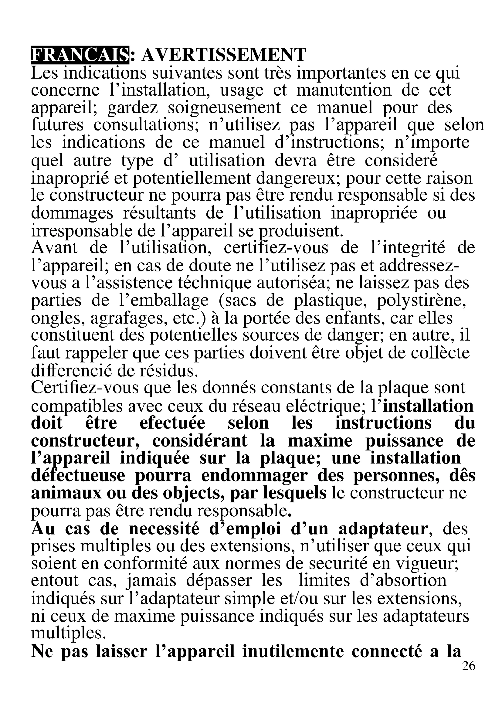 Das Symbol auf der rechten Seite zeigt, dass das Gerät den Anforderungen der neuen Richtlinien entspricht, die eingeführt wurden, um die Umwelt zu schützen (2002/96/EG, 2003/108/EG, 2002/95/EG, 2012/19/EG), und ordnungsgemäß am Ende seiner Lebensdauer entsorgt werden muss. Erkundigen Sie sich an Ihrem Wohnort, wo sich entsprechende Deponien für die Entsorgung von Elektroschrott befinden. Wenn Sie das Gerät nicht gemäß den in diesem Absatz genannten Vorschriften entsorgen, haften Sie nach den gesetzlichen Bestimmungen.26 FRANCAIS: AVERTISSEMENT Les indications suivantes sont très importantes en ce qui concerne l’installation, usage et manutention de cet appareil; gardez soigneusement ce manuel pour des futures consultations; n’utilisez pas l’appareil que selon les indications de ce manuel d’instructions; n’importe quel autre type d’ utilisation devra être consideré inaproprié et potentiellement dangereux; pour cette raison le constructeur ne pourra pas être rendu responsable si des dommages résultants de l’utilisation inapropriée ou irresponsable de l’appareil se produisent. Avant de l’utilisation, certifiez-vous de l’integrité de l’appareil; en cas de doute ne l’utilisez pas et addressez- vous a l’assistence téchnique autoriséa; ne laissez pas des parties de l’emballage (sacs de plastique, polystirène, ongles, agrafages, etc.) à la portée des enfants, car elles constituent des potentielles sources de danger; en autre, il faut rappeler que ces parties doivent être objet de collècte differencié de résidus. Certifiez-vous que les donnés constants de la plaque sont compatibles avec ceux du réseau eléctrique; l’installation doit être efectuée selon les instructions du constructeur, considérant la maxime puissance de l’appareil indiquée sur la plaque; une installation défectueuse pourra endommager des personnes, dês animaux ou des objects, par lesquels le constructeur ne pourra pas être rendu responsable. Au cas de necessité d’emploi d’un adaptateur, des prises multiples ou des extensions, n’utiliser que ceux qui soient en conformité aux normes de securité en vigueur; entout cas, jamais dépasser les limites d’absortion indiqués sur l’adaptateur simple et/ou sur les extensions, ni ceux de maxime puissance indiqués sur les adaptateurs multiples. Ne pas laisser l’appareil inutilemente connecté a la27 prise eléctrique; c’est toujours mieux de le déconnecter quand il n’est pas à l’use. Débranchez toujours l'appareil de l'alimentation électrique s'il est laissé sans surveillance. Pour le nettoyage déconnectez la fiche du secteur électrique. Quand l’appareil soit hors usage et ait été décidé qu’il ne sera pas reparé, on reccomande son inutilisation, en coupant son câble d’alimentation. - Ne pas approcher le câble d’alimentation d’objects coupants ou de surfaces chaudes, et ne pas tirer sur le cordon d’alimentation pour le débrancher de la prise. Ne le laissez pas pendre du plan de travail où un enfant pourrait le tenir. - Ne pas utiliser l’appareil si le câble d’alimentation ou la fiche de connéction eléctrique sont endommagés, ou encore en cas de court-circuits; dans ce cas là, apporter l’appareil a un centre d’assistence autorisé. - L’appareil n’est pas indiqué pour être exposé à des conditions météorologiques défavorables (pluie, vent, humidité, la glace, etc.); Gardez-le dans un endroit sec. Jamais opérer ou même toucher l’appareil avec les mains mouillées ou les pieds nus. - Cet appareil peut être utilisé par des enfants agés de plus de 8 ans et par des personnes avec une réduite capacité phisique, sensorial ou mental, ou encore avec peu d’expérience à son usage, pourvu qu’une supervision adéquate leur en soit assuré, ou s’ils auraient été instruits à l’usage de l’appareil en complete securité. Les opérations de nettoyage e de manutention ne oivent pás être efectués par des enfants, sauf pour ceux qui sont agés de plus de 8 ans et sont supervisionés. - Les enfants ne doivent pas jouer avec cet appareil. - Gardez l’appareil et le câble d’alimentation hors la portée des enfants agés de moins de 8 ans.28 Si le câble d'alimentation est endommagé ou en cas de panne et / ou de dysfonctionnement, ne modifiez pas l'appareil. Toute réparation doit être effectuée par le fabricant ou par son service d'assistance technique ou, en tout cas, par une personne possédant une qualification similaire, afin d'éviter tout risque. Le non-respect de ce qui précède peut compromettre la sécurité de l'appareil et invalider les conditions de la garantie. - Cet appareil est destiné à être utilisé dans les ménages et des applications similaires : les cuisines du personnel dans les magasins, bureaux et autres environnements de travail, pour les clients dans les hôtels, motels et autres environnements de type résidentiel, de type lit et petit- déjeuner, hébergement. - L’appareil n’est pas conçu pour être utilisé avec une minuterie extérieure ou une commande à distance. - N’utiliser que des accéssoires e pièces d’origine. - Avant chaque utilisation, effectuez le cordon d'alimentation. Ne soumettez pas le produit à des chocs susceptibles de l'endommager.