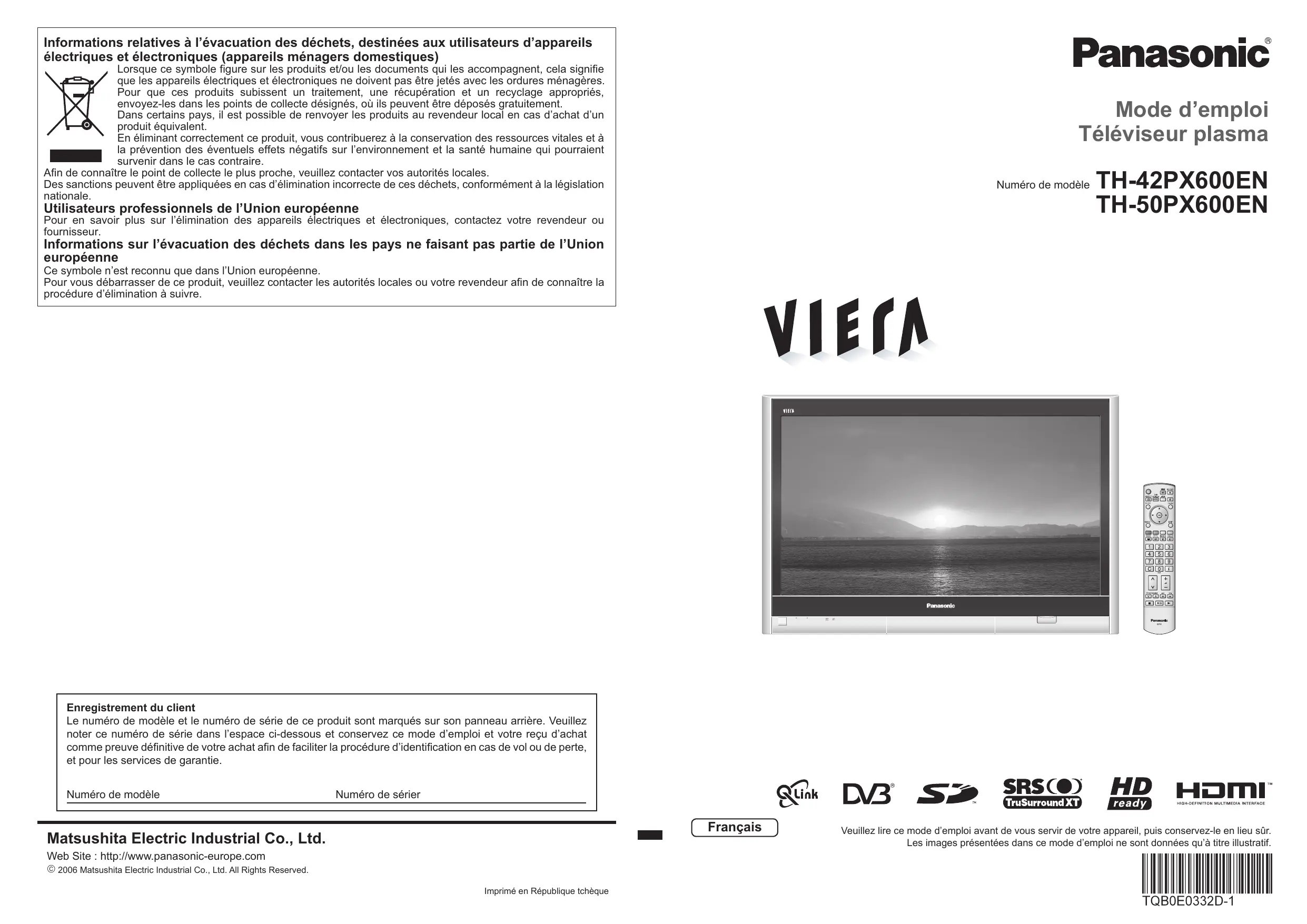 Informations relatives à l’évacuation des déchets, destinées aux utilisateurs d’appareils électriques et électroniques (appareils ménagers domestiques) Lorsque ce symbole figure sur les produits et/ou les documents qui les accompagnent, cela signifie que les appareils électriques et électroniques ne doivent pas être jetés avec les ordures ménagères. Pour que ces produits subissent un traitement, une récupération et un recyclage appropriés, envoyez-les dans les points de collecte désignés, où ils peuvent être déposés gratuitement. Dans certains pays, il est possible de renvoyer les produits au revendeur local en cas d’achat d’un produit équivalent. En éliminant correctement ce produit, vous contribuerez à la conservation des ressources vitales et à la prévention des éventuels effets négatifs sur l’environnement et la santé humaine qui pourraient survenir dans le cas contraire. Afin de connaître le point de collecte le plus proche, veuillez contacter vos autorités locales. Des sanctions peuvent être appliquées en cas d’élimination incorrecte de ces déchets, conformément à la législation nationale. Mode d’emploi Téléviseur plasma Numéro de modèle Utilisateurs professionnels de l’Union européenne Pour en savoir plus sur l’élimination des appareils électriques et électroniques, contactez votre revendeur ou fournisseur. TH-42PX600EN TH-50PX600EN Informations sur l’évacuation des déchets dans les pays ne faisant pas partie de l’Union européenne Ce symbole n’est reconnu que dans l’Union européenne. Pour vous débarrasser de ce produit, veuillez contacter les autorités locales ou votre revendeur afin de connaître la procédure d’élimination à suivre. GUIDE STTL IDTV Enregistrement du client Le numéro de modèle et le numéro de série de ce produit sont marqués sur son panneau arrière. Veuillez noter ce numéro de série dans l’espace ci-dessous et conservez ce mode d’emploi et votre reçu d’achat comme preuve définitive de votre achat afin de faciliter la procédure d’identification en cas de vol ou de perte, et pour les services de garantie. Numéro de modèle Numéro de sérier Français Matsushita Electric Industrial Co., Ltd. Web Site : http://www.panasonic-europe.com © 2006 Matsushita Electric Industrial Co., Ltd. All Rights Reserved. Imprimé en République tchèque Veuillez lire ce mode d’emploi avant de vous servir de votre appareil, puis conservez-le en lieu sûr. Les images présentées dans ce mode d’emploi ne sont données qu’à titre illustratif. Transformez votre salon en salle de cinéma ! Vivez une expérience multimédia d’un incroyable niveau Table des matières Sections à lire impérativement Savourez une abondance de multimédias Caméscope Mesures de sécurité ···································· 4 (Avertissement / Attention) Remarques ················································· 5 Entretien ······················································ 5 Guide de mise en route rapide Accessoires / Options ·········· 6 Identifier les commandes ··· 7 Raccordement ························· 8 Configuration automatique ··· 9 Ordinateur personnel Découvrez votre téléviseur ! Amplificateur à système d’enceintes Enregistreur DVD Magnétoscope Décodeur Lecteur DVD Fonctions de base