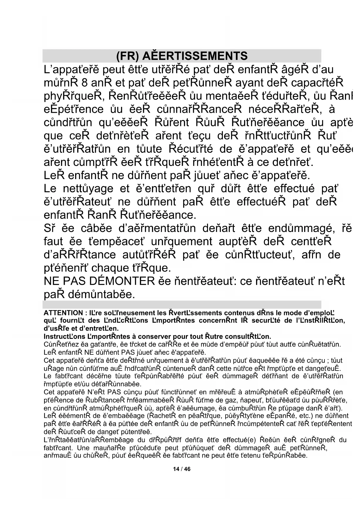 Avant d’effectuer les opérations de nettoyage, éteindre le ventilateur et le débrancher du réseau d’alimentation électrique. NE PAS DÉMONTER le ventilateur: ce ventilateur n’est pas démontable. Pour le nettoyage extérieur, utiliser un chiffon doux et sec. Il NE faut PAS plonger le ventilateur dans l’eau, ni le vaporiser avec des liquides quelconques. Il NE faut PAS utiliser de solvants ou d’autres produits chimiques pour le nettoyage. Lorsqu’il n’est pas utilisé, conserver le ventilateur dans un endroit sec.19 / 46