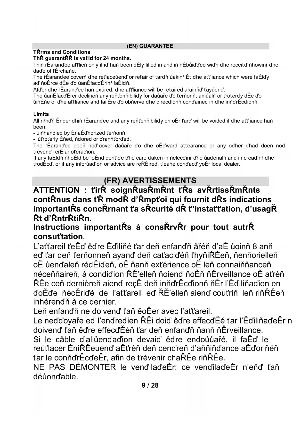 Place the fan on a flat, dry and stable surface, and insert the plug of the fan in a socket. Select the desired speed by turn the knob (1): 0 =off 1 =minimum speed 2 =medium speed 3 =maximum speed TIMER Turn the timer knob for set how long the fan must work before automatically shutting down (from 0 to 60 minutes). Please note: when the knob is in Off position the fan doesn’t work also if turn the speed knob. Please note: when the knob is in On position the fan work according to the set speed. If the knob is in On position automatically shut down isn’t set, for turn off the fan rotate the knob in Off position manually. ROTATING GRID Set the switch (3) to “I” to activate the rotating grid. Set the switch (3) to “0” to deactivate the rotating grid. (EN) MAINTENANCE Before carrying out the regular cleaning operations turn off the fan and unplug it. DO NOT disassemble the fan: this fan cannot be disassembled. For external cleaning use a soft and dry cloth. DO NOT dip the device in water, or splash it with any other liquids. DO NOT use solvents or any other chemical products for cleaning it. When you do not use it, after cleaning it, store the fan in a dry place. (EN) DISPOSAL PACKAGING In order to respect the environment, packaging material must be disposed of properly in accordance with separate collection. Check local regulations. USER INFORMATION “Implementation of Directive 2012/19/EU on Waste Electrical and Electronic Equipment (WEEE)”, pertaining to reduced use of hazardous substances in electrical and electronic equipment, as well as to waste disposal. The symbol of the crossed-out wheelie bin on the equipment or on its packaging indicates that the product must be disposed of separately from other waste at the end of its service life. The user must therefore take the dismissed equipment to suitable separate collection centres for electrical and electronic waste. For more details, please contact the appropriate local authority. Suitable segregated collection of the equipment for subsequent recycling, treatment or environmentally-friendly disposal helps prevent damage to the environment and to human health, and encourages the re-use and/or recycling of the materials that make up the equipment. Abusive disposal of the product by the user shall result in the application of administrative fines in accordance with the laws in force.9 / 28 (EN) GUARANTEE Terms and Conditions The guarantee is valid for 24 months. This guarantee applies only if it has been duly filled in and is submitted with the receipt showing the date of purchase. The guarantee covers the replacement or repair of parts making up the appliance which were faulty at source due to manufacturing faults. After the guarantee has expired, the appliance will be repaired against payment. The manufacturer declines any responsibility for damage to persons, animals or property due to misuse of the appliance and failure to observe the directions contained in the instructions. Limits All rights under this guarantee and any responsibility on our part will be voided if the appliance has been: - mishandled by unauthorized persons - improperly used, stored or transported. The guarantee does not cover damage to the outward appearance or any other that does not prevent regular operation. If any faults should be found despite the care taken in selecting the materials and in creating the product, or if any information or advice are required, please contact your local dealer. (FR) AVERTISSEMENTS ATTENTION : lire soigneusement les avertissements contenus dans le mode d’emploi qui fournit des indications importantes concernant la securité de l’installation, d’usage et d’entretien. Instructions importantes à conserver pour tout autre consultation. L’appareil peut être utilisé par des enfants âgés d’au moins 8 ans et par des personnes ayant des capacités physiques, sensorielles ou mentales réduites, ou sans expérience ou les connaissances nécessaires, à condition qu’elles soient sous surveillance ou après que ces dernières aient reçu des instructions sur l’utilisation en toute sécurité de l’appareil et qu’elles aient compris les risques inhérents à ce dernier. Les enfants ne doivent pas jouer avec l’appareil. Le nettoyage et l’entretien qui doit être effectué par l’utilisateur ne doivent pas être effectués par des enfants sans surveillance. Si le câble d’alimentation devait être endommagé, il faut le remplacer uniquement auprès des centres d’assistance autorisés par le constructeur, afin de prévenir chaque risque. NE PAS DÉMONTER le ventilateur: ce ventilateur n’est pas démontable.10 / 28 Conservez la garantie, le ticket de caisse et le mode d’emploi pour tout autre consultation. Après le déballage, vérifiez l’intégrité de l’appareil. En cas de dommage, n’utilisez pas l’appareil et appelez subitement le personnel qualifié. Ne laissez jamais les parties de l’emballage auprès des enfants, ne les utilisez pas en tant que jouets: il s’agit d’un appareil électrique, il ne doit pas être utilisé autrement. Les enfants ne doivent pas jouer avec l’appareil. Ce produit ne doit être qu’utilisé uniquement dans le but pour lequel il a été conçu. Toute utilisation non conforme aux instructions données dans cette notice est considérée comme inappropriée et dangereuse. Ce produit ne doit pas être utilisé dans un environnement explosif (en présence de produits inflammables tels que le gaz, vapeur, poussières etc qui dans certaines conditions atmosphériques et après départ de feu, peuvent se propager dans l’air). Avant de brancher l’appareil, vérifiez que la tension du réseau électrique correspond à celle mentionnée sur la plaque signalétique de celui-ci. L’appareil ne doit être branché que sur un réseau électrique dont l’installation est conforme aux normes de sécurité. Ne pas brancher cet appareil sur une multiprise. Si possi