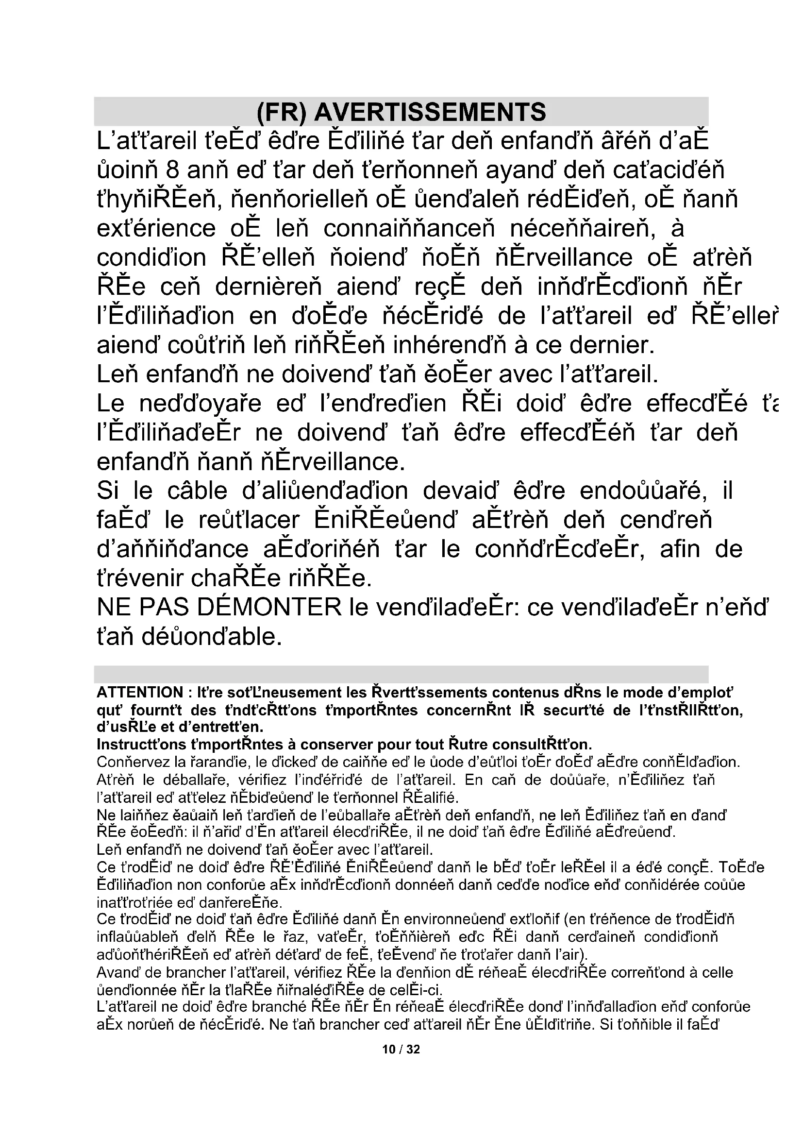 Avant d’effectuer les opérations de nettoyage, éteindre le ventilateur et le débrancher du réseau d’alimentation électrique. NE PAS DÉMONTER le ventilateur: ce ventilateur n’est pas démontable. Pour le nettoyage extérieur, utiliser un chiffon doux et sec. Il NE faut PAS plonger le ventilateur dans l’eau, ni le vaporiser avec des liquides quelconques. Il NE faut PAS utiliser de solvants ou d’autres produits chimiques pour le nettoyage. Lorsqu’il n’est pas utilisé, conserver le ventilateur dans un endroit sec.13 / 32 (FR) DISPOSITION