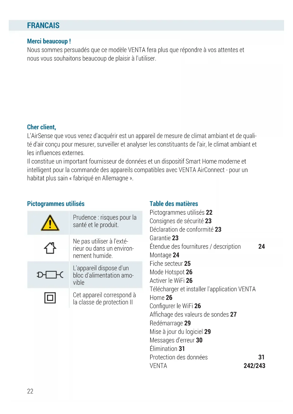 Pictogrammes utilisés Merci beaucoup! Nous sommes persuadés que ce modèle VENTA fera plus que répondre à vos attentes et nous vous souhaitons beaucoup de plaisir à l'utiliser. Cher client, L'AirSense que vous venez d'acquérir est un appareil de mesure de climat ambiant et de quali- té d'air conçu pour mesurer, surveiller et analyser les constituants de l'air, le climat ambiant et les influences externes. Il constitue un important fournisseur de données et un dispositif Smart Home moderne et intelligent pour la commande des appareils compatibles avec VENTA AirConnect - pour un habitat plus sain «fabriqué en Allemagne». Prudence: risques pour la santé et le produit. Ne pas utiliser à l'exté- rieur ou dans un environ- nement humide. L'appareil dispose d'un bloc d'alimentation amo- vible Cet appareil correspond à la classe de protection II Table des matières Pictogrammes utilisés 22 Consignes de sécurité 23 Déclaration de conformité 23 Garantie 23 Étendue des fournitures / description 24 Montage 24 Fiche secteur 25 Mode Hotspot 26 Activer le WiFi 26 Télécharger et installer l'application VENTA Home 26 Congurer le WiFi 26 Afchage des valeurs de sondes 27 Redémarrage 29 Mise à jour du logiciel 29 Messages d'erreur 30 Élimination 31 Protection des données 31 VENTA 242/243FRANCAIS