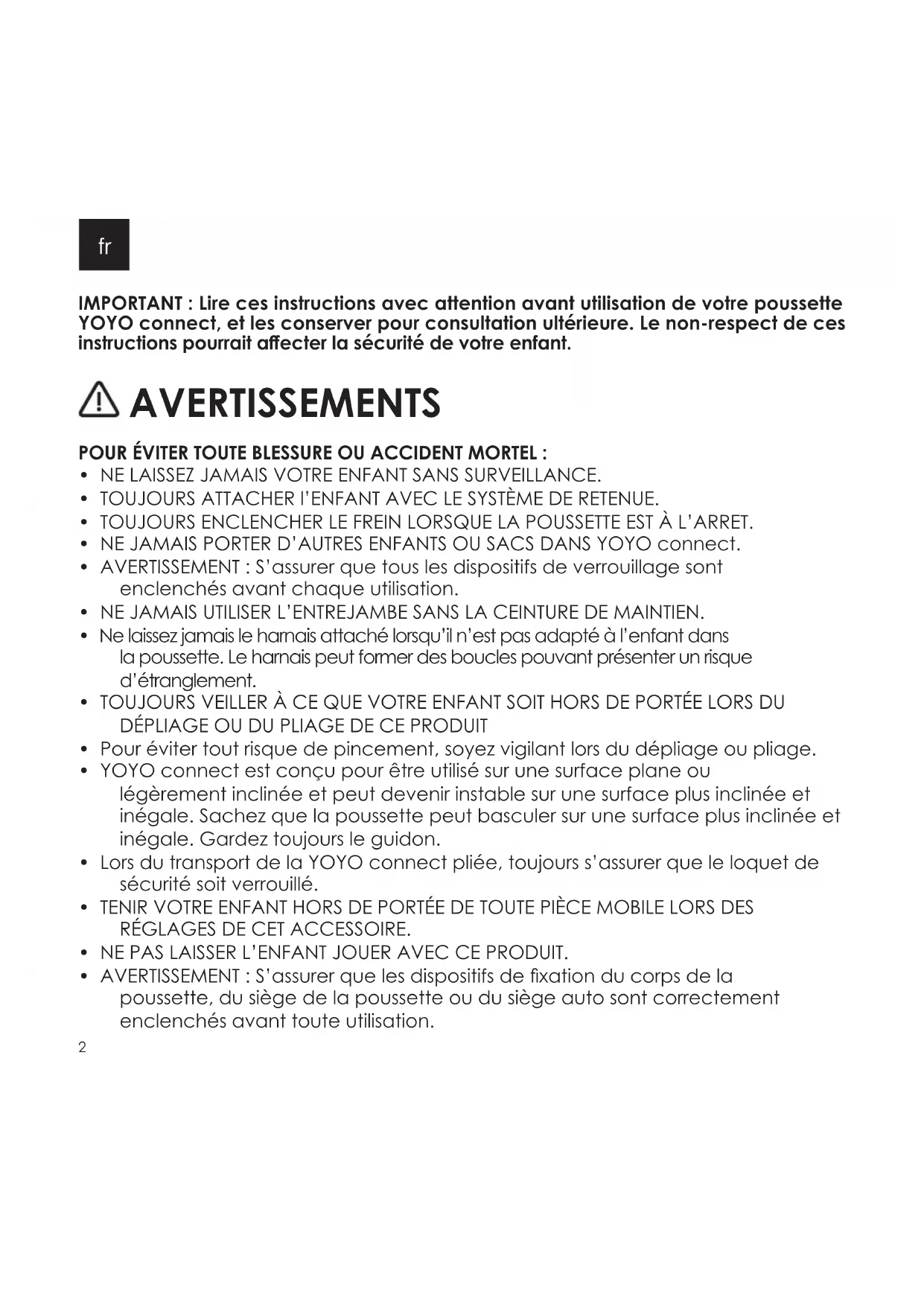 6fr IMPORTANT : Lire ces instructions avec attention avant utilisation de votre poussette YOYO connect, et les conserver pour consultation ultérieure. Le non-respect de ces instructions pourrait aecter la sécurité de votre enfant. AVERTISSEMENTS POUR ÉVITER TOUTE BLESSURE OU ACCIDENT MORTEL :