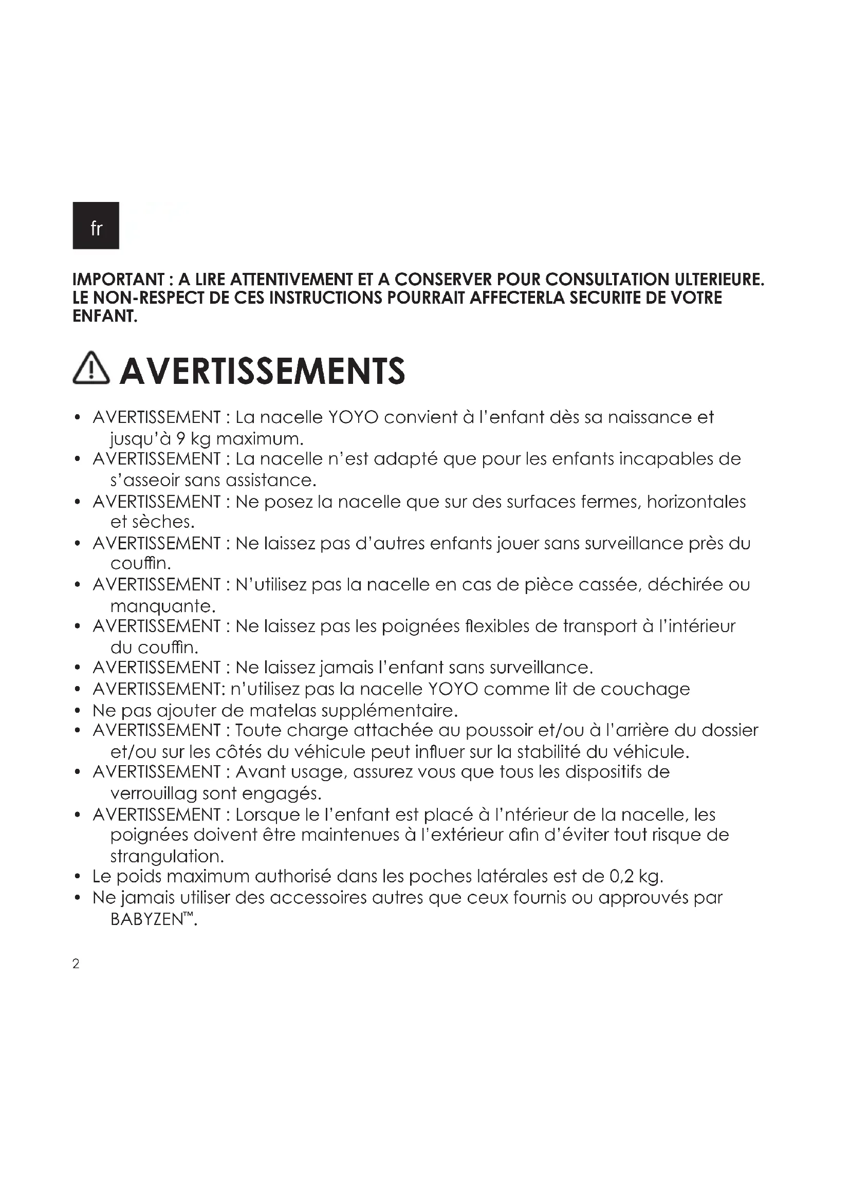 - AVERTISSEMENT: n’utilisez pas la nacelle YOYO comme lit de couchage