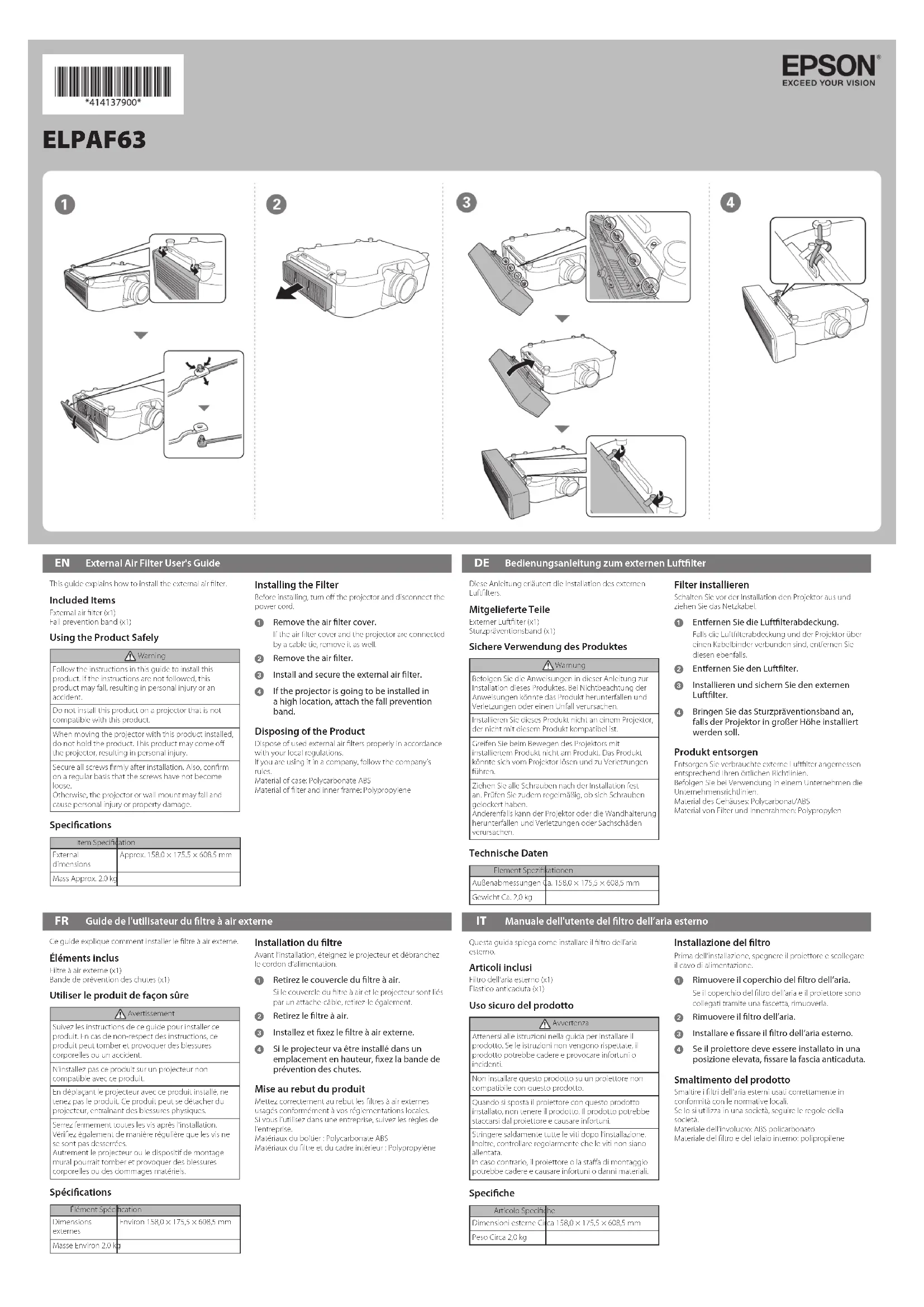 Si le projecteur va être installé dans un emplacement en hauteur, xez la bande de prévention des chutes. Mise au rebut du produit Mettez correctement au rebut les ltres à air externes usagés conformément à vos réglementations locales. Si vous l’utilisez dans une entreprise, suivez les règles de l’entreprise. Matériaux du boîtier: Polycarbonate ABS Matériaux du ltre et du cadre intérieur: Polypropylène ELPAF63