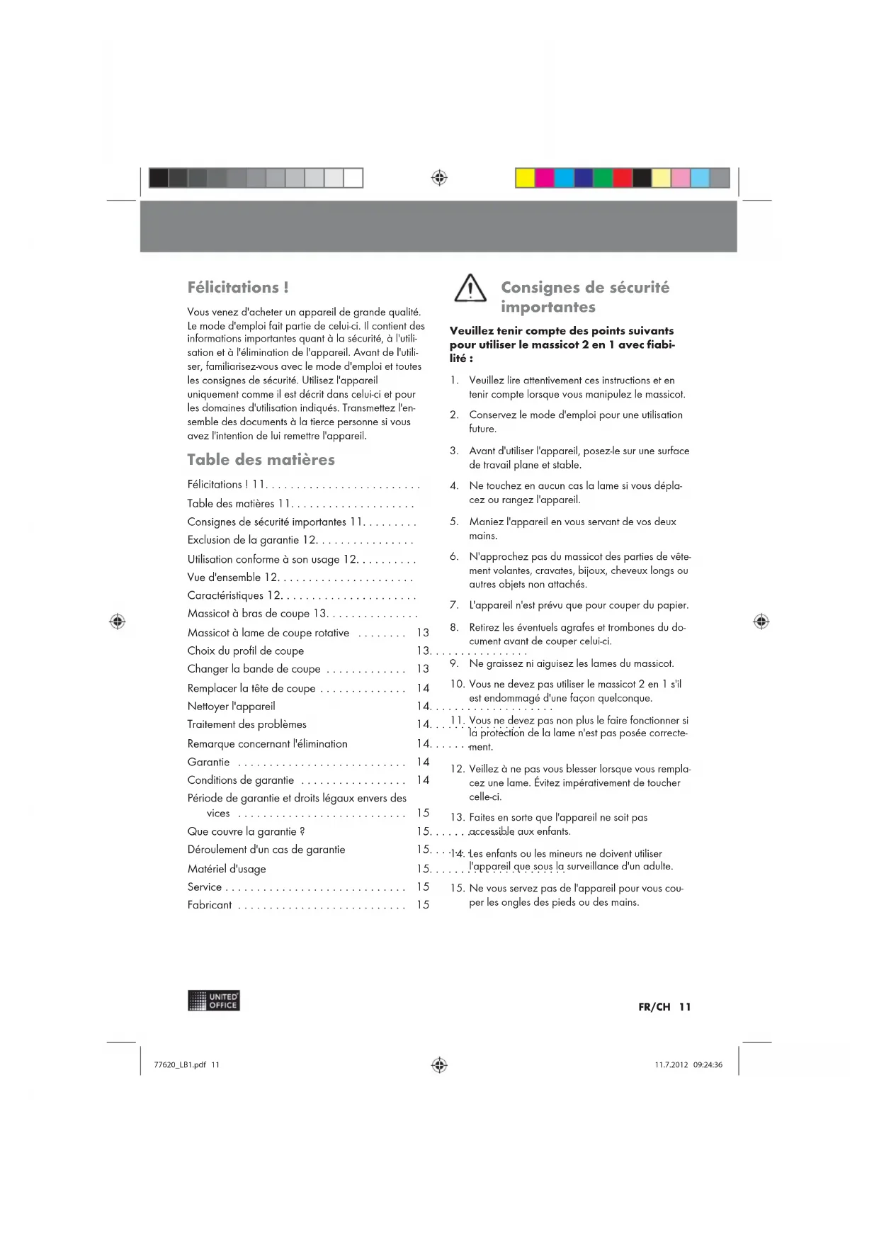 service.de@jet-servicenet.com service.at@jet-servicenet.com service.ch@jet-servicenet.com GSL Gesellschaft für Service + Logistik in Mit teldeutschland mbH Am Weimarer Berg 6 D-99510 Apolda / Thüringen GERMANY Produzent Olympia Business Systems Vertriebs GmbH Zum Kraftwerk 1 D-45527 Hattingen GERMANY 77620_LB1.pdf 1077620_LB1.pdf 10 11.7.2012 09:24:3611.7.2012 09:24:36FR/CH 11 Félicitations ! Vous venez d'acheter un appareil de grande qualité. Le mode d'emploi fait partie de celui-ci. Il contient des informations importantes quant à la sécurité, à l'utili sation et à l'élimination de l'appareil. Avant de l'utili ser, familiarisez-vous avec le mode d'emploi et toutes les consignes de sécurité. Utilisez l'appareil uniquement comme il est décrit dans celui-ci et pour les domaines d'utilisation indiqués. Transmettez l'en semble des documents à la tierce personne si vous avez l'intention de lui remettre l'appareil. Table des matières Félicitations ! 11......................... Table des matières 11.................... Consignes de sécurité importantes 11......... Exclusion de la garantie 12................ Utilisation conforme à son usage 12.......... Vue d'ensemble 12...................... Caractéristiques 12...................... Massicot à bras de coupe 13............... Massicot à lame de coupe rotative 13........ Choix du profil de coupe 13................ Changer la bande de coupe 13............. Remplacer la tête de coupe 14.............. Nettoyer l'appareil 14.................... Traitement des problèmes 14............... Remarque concernant l'élimination 14......... Garantie 14........................... Conditions de garantie 14................. Période de garantie et droits légaux envers des vices 15........................... Que couvre la garantie ? 15............... Déroulement d'un cas de garantie 15......... Matériel d'usage 15...................... Service 15............................. Fabricant 15........................... Consignes de sécurité importantes Veuillez tenir compte des points suivants pour utiliser le massicot 2 en 1 avec fiabi lité :