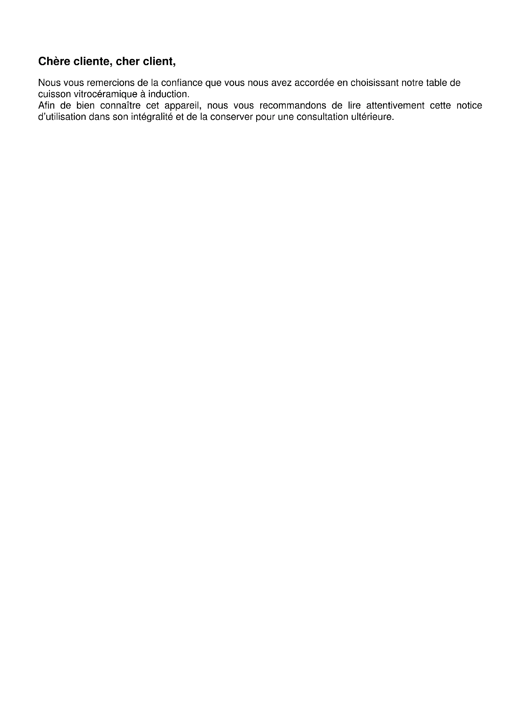 Table de cuisson Induction - Induction Hob NOTICE D’UTILISATION - INSTRUCTION OF USEChère cliente, cher client, Nous vous remercions de la confiance que vous nous avez accordée en choisissant notre table de cuisson vitrocéramique à induction. Afin de bien connaître cet appareil, nous vous recommandons de lire attentivement cette notice d’utilisation dans son intégralité et de la conserver pour une consultation ultérieure.3 SECURITE Précautions avant utilisation en cuisson