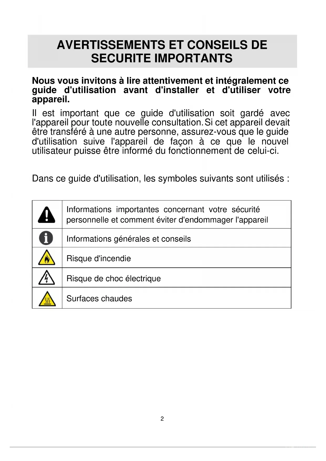 SECURITE IMPORTANTS3 Conseils de sécurité importants Avertissements Cet appareil doit être installé conformément à la réglementation en vigueur et utilisé seulement dans