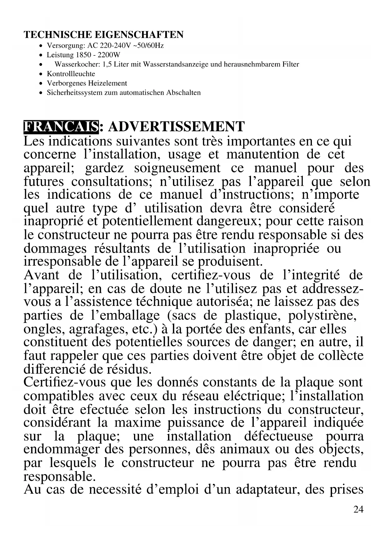 FRANCAIS: ADVERTISSEMENT Les indications suivantes sont très importantes en ce qui concerne l’installation, usage et manutention de cet appareil; gardez soigneusement ce manuel pour des futures consultations; n’utilisez pas l’appareil que selon les indications de ce manuel d’instructions; n’importe quel autre type d’ utilisation devra être consideré inaproprié et potentiellement dangereux; pour cette raison le constructeur ne pourra pas être rendu responsable si des dommages résultants de l’utilisation inapropriée ou irresponsable de l’appareil se produisent. Avant de l’utilisation, certifiez-vous de l’integrité de l’appareil; en cas de doute ne l’utilisez pas et addressez- vous a l’assistence téchnique autoriséa; ne laissez pas des parties de l’emballage (sacs de plastique, polystirène, ongles, agrafages, etc.) à la portée des enfants, car elles constituent des potentielles sources de danger; en autre, il faut rappeler que ces parties doivent être objet de collècte differencié de résidus. Certifiez-vous que les donnés constants de la plaque sont compatibles avec ceux du réseau eléctrique; l’installation doit être efectuée selon les instructions du constructeur, considérant la maxime puissance de l’appareil indiquée sur la plaque; une installation défectueuse pourra endommager des personnes, dês animaux ou des objects, par lesquels le constructeur ne pourra pas être rendu responsable. Au cas de necessité d’emploi d’un adaptateur, des prises25 multiples ou des extensions, n’utiliser que ceux qui soient en conformité aux normes de securité en vigueur; entout cas, jamais dépasser les limites d’absortion indiqués sur l’adaptateur simple et/ou sur les extensions, ni ceux de maxime puissance indiqués sur les adaptateurs multiples. Ne pas laisser l’appareil inutilemente connecté a la prise eléctrique; c’est toujours mieux de le déconnecter quand il n’est pas à l’use. Débranchez toujours l'appareil de l'alimentation électrique s'il est laissé sans surveillance. Pour le nettoyage déconnectez la fiche du secteur électrique. Quand l’appareil soit hors usage et ait été décidé qu’il ne sera pas reparé, on reccomande son inutilisation, en coupant son câble d’alimentation. - Ne pas approcher le câble d’alimentation d’objects coupants ou de surfaces chaudes, et ne pas tirer sur le cordon d’alimentation pour le débrancher de la prise. Ne le laissez pas pendre du plan de travail où un enfant pourrait le tenir. - Ne pas utiliser l’appareil si le câble d’alimentation ou la fiche de connéction eléctrique sont endommagés, ou encore en cas de court-circuits; dans ce cas là, apporter l’appareil a un centre d’assistence autorisé. - L’appareil n’est pas indiqué pour être exposé à des conditions météorologiques défavorables (pluie, vent, humidité, la glace, etc.); Gardez-le dans un endroit sec. Jamais opérer ou même toucher l’appareil avec les mains mouillées ou les pieds nus. - Cet appareil peut être utilisé par des enfants agés de plus de 8 ans et par des personnes avec une réduite capacité phisique, sensorial ou mental, ou encore avec peu d’expérience à son usage, pourvu qu’une supervision adéquate leur en soit assuré, ou s’ils auraient été instruits à l’usage de l’appareil en complete securité. Les26 opérations de nettoyage e de manutention ne oivent pás être efectués par des enfants, sauf pour ceux qui sont agés de plus de 8 ans et sont supervisionés. - Les enfants ne doivent pas jouer avec cet appareil. - Gardez l’appareil et le câble d’alimentation hors la portée des enfants agés de moins de 8 ans. Si le câble d'alimentation est endommagé ou en cas de panne et / ou de dysfonctionnement, ne modifiez pas l'appareil. Toute réparation doit être effectuée par le fabricant ou par son service d'assistance technique ou, en tout cas, par une personne possédant une qualification similaire, afin d'éviter tout risque. Le non-respect de ce qui précède peut compromettre la sécurité de l'appareil et invalider les conditions de la garantie. ATTENTION: Cet appareil comporte une fonction de chauffage. Quelques surfaces, même si non la plaque elle même, pourront atteindre des températures élevées. Étant donné que la sensibilité à la température diffère de personne à personne, cet appareil devrà être usé avec PRUDENCE. Placez l’appareil sur des surfaces adéhrentes et préparées pour cet effet, et utilisez les mésures de protection contre la chaleur conseillées. - Cet appareil est destiné à être utilisé dans les ménages et des applications similaires: les cuisines du personnel dans les magasins, bureaux et autres environnements de travail, pour les clients dans les hôtels, motels et autres environnements de type résidentiel, de type lit et petit- déjeuner, hébergement. - L’appareil n’est pas conçu pour être utilisé avec une minuterie extérieure ou un commande à distance. - N’utiliser que des accéssoires e pièces d’origine. - Avant chaque utilisation, effectuez le cordon d'alimentation. Ne soumettez pas le produit à des chocs susceptibles de l'endommager. - Tenir l’appareil à l’écart des environnements où il peut y27 avoir des gaz, vapeurs, des substances inflammables ou explosives. MODE D’EMPLOI. A la première utilisation, nettoyer les pièces qui seront en contact avec les aliments: l'intérieur de la bouilloire. Jamais activer l'appareil lorsqu'il est encore emballé. Utilisez la bouilloire uniquement pour chauffer ou faire bouillir l'eau. Remplissez la bouilloire avec de l'eau froide, en prenant soin de rester dans les limites de capacité fixés sur le réservoir (MAX 1.5L, MIN 0.5L). Toujours verser l'eau avant d'allumer la bouilloire. Ne jamais introduire des liquides après l'allumage. Si la bouilloire est mise à fonctionner vide, le dispositif de sécurité intégré l'éteind
