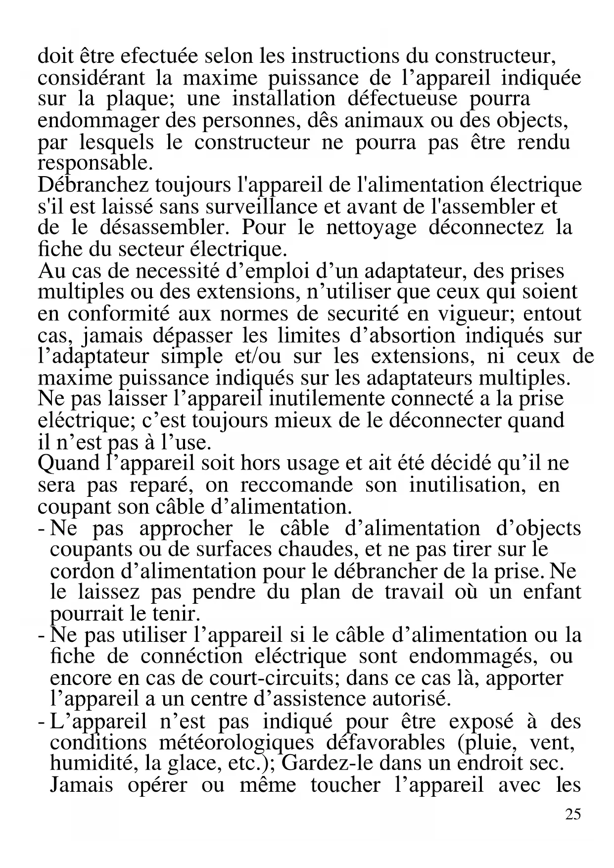 FRANCAIS: ADVERTISSEMENT Les indications suivantes sont très importantes en ce qui concerne l’installation, usage et manutention de cet appareil; gardez soigneusement ce manuel pour des futures consultations; n’utilisez pas l’appareil que selon les indications de ce manuel d’instructions; n’importe quel autre type d’ utilisation devra être consideré inaproprié et potentiellement dangereux; pour cette raison le constructeur ne pourra pas être rendu responsable si des dommages résultants de l’utilisation inapropriée ou irresponsable de l’appareil se produisent. Avant de l’utilisation, certifiez-vous de l’integrité de l’appareil; en cas de doute ne l’utilisez pas et addressez- vous a l’assistence téchnique autoriséa; ne laissez pas des parties de l’emballage (sacs de plastique, polystirène, ongles, agrafages, etc.) à la portée des enfants, car elles constituent des potentielles sources de danger; en autre, il faut rappeler que ces parties doivent être objet de collècte differencié de résidus. Certifiez-vous que les donnés constants de la plaque sont compatibles avec ceux du réseau eléctrique; l’installation25 doit être efectuée selon les instructions du constructeur, considérant la maxime puissance de l’appareil indiquée sur la plaque; une installation défectueuse pourra endommager des personnes, dês animaux ou des objects, par lesquels le constructeur ne pourra pas être rendu responsable. Débranchez toujours l'appareil de l'alimentation électrique s'il est laissé sans surveillance et avant de l'assembler et de le désassembler. Pour le nettoyage déconnectez la fiche du secteur électrique. Au cas de necessité d’emploi d’un adaptateur, des prises multiples ou des extensions, n’utiliser que ceux qui soient en conformité aux normes de securité en vigueur; entout cas, jamais dépasser les limites d’absortion indiqués sur l’adaptateur simple et/ou sur les extensions, ni ceux de maxime puissance indiqués sur les adaptateurs multiples. Ne pas laisser l’appareil inutilemente connecté a la prise eléctrique; c’est toujours mieux de le déconnecter quand il n’est pas à l’use. Quand l’appareil soit hors usage et ait été décidé qu’il ne sera pas reparé, on reccomande son inutilisation, en coupant son câble d’alimentation. - Ne pas approcher le câble d’alimentation d’objects coupants ou de surfaces chaudes, et ne pas tirer sur le cordon d’alimentation pour le débrancher de la prise. Ne le laissez pas pendre du plan de travail où un enfant pourrait le tenir. - Ne pas utiliser l’appareil si le câble d’alimentation ou la fiche de connéction eléctrique sont endommagés, ou encore en cas de court-circuits; dans ce cas là, apporter l’appareil a un centre d’assistence autorisé. - L’appareil n’est pas indiqué pour être exposé à des conditions météorologiques défavorables (pluie, vent, humidité, la glace, etc.); Gardez-le dans un endroit sec. Jamais opérer ou même toucher l’appareil avec les26 mains mouillées ou les pieds nus. - Cet appareil peut être utilisé par des enfants agés de plus de 8 ans et par des personnes avec une réduite capacité phisique, sensorial ou mental, ou encore avec peu d’expérience à son usage, pourvu qu’une supervision adéquate leur en soit assuré, ou s’ils auraient été instruits à l’usage de l’appareil en complete securité. Les opérations de nettoyage e de manutention ne oivent pás être efectués par des enfants, sauf pour ceux qui sont agés de plus de 8 ans et sont supervisionés. - Les enfants ne doivent pas jouer avec cet appareil. - Gardez l’appareil et le câble d’alimentation hors la portée des enfants agés de moins de 8 ans. - L’appareil est pour l’usage domestique et intérieur. Au cas de panne et/ou de mauvais fonctionnement, ne pas intervenir sur l’ appareil. Pour une éventuel réparation s’addresser uniquement a un centre autorisé par le constructeur, en demandant dês pièces de remplacement originaux. Le non respect de ces indications peut compromettre la securité de l’appareil e rendre invalides les termes de la garantie. ATTENTION: Cet appareil comporte une fonction de chauffage. Quelques surfaces, même si non la plaque elle même, pourront atteindre des températures élevées. Étant donné que la sensibilité à la température diffère de personne à personne, cet appareil devrà être usé avec PRUDENCE. Placez l’appareil sur des surfaces adéhrentes et préparées pour cet effet, et utilisez les mésures de protection contre la chaleur conseillées, comme dês poignées ou des gants de cuisine. - Cet appareil est destiné à être utilisé dans les ménages et des applications similaires: les cuisines du personnel dans les magasins, bureaux et autres environnements de travail, pour les clients dans les hôtels, motels et autres environnements de type résidentiel, de type lit et petit-27 déjeuner, hébergement. - L’appareil n’est pas conçu pour être utilisé avec une minuterie extérieure ou un commande à distance. - N’utiliser que des accéssoires e pièces d’origine. - Avant chaque utilisation, effectuez le cordon d'alimentation. Ne soumettez pas le produit à des chocs susceptibles de l'endommager. - Tenir l’appareil à l’écart des environnements où il peut y avoir des gaz, vapeurs, des substances inflammables ou explosives. MODE D’EMPLOI. A la première utilisation, nettoyer les pièces qui seront en contact avec les aliments: l'intérieur de la bouilloire. Jamais activer l'appareil lorsqu'il est encore emballé. Utilisez la bouilloire uniquement pour chauffer ou faire bouillir l'eau. Remplissez la bouilloire avec de l'eau froide, en prenant soin de rester dans les limites de capacité fixés sur le réservoir (MAX 1.7L, MIN 0.5L). Toujours verser l'eau avant d'allumer la bouilloire. Ne jamais introduire des liquides après l'allumage. Si la bouilloire est m